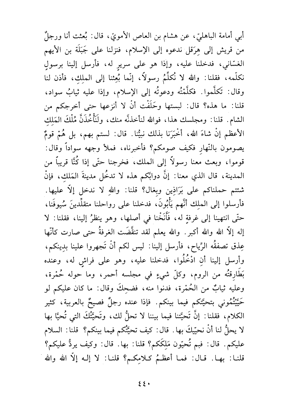 حلمناكم على براذين وبغال؟ قلنا: والله لا ندخل إلا عليها، فأرسلوا إلى الملك أنهم يأبون، فدخلنا على رواحلنا متقلدين سيوفنا، حتى انتهينا إلى غرفة له، فأنخنا في أصلها، وهو ينظر إلينا، فقلنا: لا إله إلا الله والله أكبر، والله يعلم لقد تنقضت الغرفة حتى صارت كأنها عذق تصفقه الرياح، فأرسل إلينا: ليس لكم أن تجهروا علينا بدينكم، وأرسل إلينا أن أدخلوا، فدخلنا عليه، وهو على فراش له، عنده بطارقته من الروم، وكل شيء في مجلسه أحمد، وما حوله حمرة، وعليه ثياب من الحمرة، فدنوا منه، فضحك وقال: ما كان عليكم لو حييتموني بتحيتكم. فإذا عنده رجل فصيح بالعربية، كثير الكلام، فقلنا: إن تحيتنا فيما بيننا لا تحل لك، وتحيتك التي تحيا بها لا يحل لنا أن نحييك بها قال: كيف تحيتكم فيما بينكم؟ قلنا: السلام عليكم قال: فبم تحيون ملككم؟ قلنا: بها قال: وكيف يرد عليكم؟ قلنا: بها قال: فما أعظم كلامكم؟ قلنا: لا إله إلا الله والله