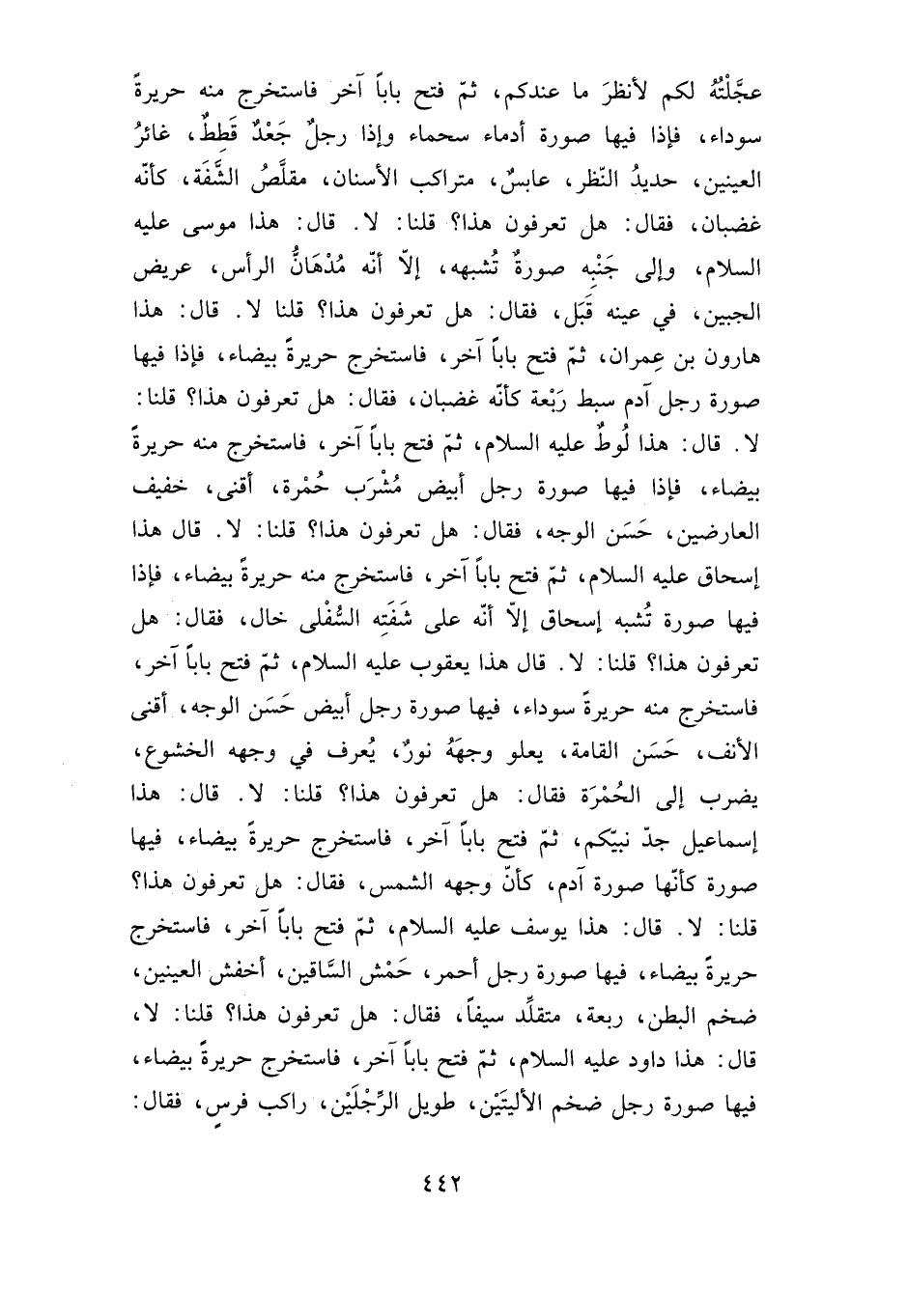 عجلته لكم لأنظر ما عندكم، ثم فتح بابا آخر فاستخرج منه حريرة سوداء، فإذا فيها صورة أدماء سحماء وإذا رجل جعد قطط، غائر العينين، حديد النظر، عابس، متراكب الأسنان، مقلص الشفة، كأنه غضبان، فقال: هل تعرفون هذا؟ قلنا: لا قال: هذا موسى عليه السلام وإلى جنبه صورة تشبهه إلا أنه مدهان الرأس، عريض الجبين، في عينه قبل، فقال: هل عرفون هذا؟ قلنا: لا قال: هذا هارون بن عمران، ثم فتح بابا آخر، فاستخرج حريرة بيضاء، فإذا فيها صورة رجل آدم سبط ربعة كأنه غضبان، فقال: هل تعرفون هذا؟ قلنا: لا قال: هذا لوط عليه السلام ثم فتح بابا آخر، فاستخرج منه حريرة بيضاء، فإذا فيها صورة رجل أبيض مشرب حمرة، أقنى، خفيف العارضين، حسن الوجه، فقال: هل تعرفون هذا؟ قلنا: لا قال هذا إسحاق عليه السلام، ثم فتح بابا آخر، فاستخرج منه حريرة بيضاء، فإذا فيها صورة تشبه إسحاق إلا أنه على شفته السفلى خال، فقال: هل تعرفون هذا؟ قلنا: لا قال: هذا يعقوب عليه السلام، ثم فتح بابا آخر، فاستخرج منه حريرة سوداء، فيها صورة رجل أبيض حسن الوجه أقنى الأنف حسن القامة يعلو وجهه نور يعرف في وجه الخشوع يضرب إلى الحمرة فقال: هل تعرفون هذا؟ قلنا: لا قال: هذا إسماعيل جد نبيكم، ثم فتح بابا آخر، فاستخرج حريرة بيضاء فيها صورة كأنها صورة آدم، كأنه وجهه الشمس، فقال: هل تعرفون هذا؟ قلنا: لا قال: هذا يوسف عليه السلام، ثم فتح بابا آخر، فاستخرج حريرة بيضاء، فيها صورة رجل أحمر، حمش الساقين، أخفش العينين، ضخم البطن، ربعة متقلد سيفا، فقال: هل تعرفون هذا؟ قلنا: لا قال: هذا داود عليه السلام ثم فتح بابا آخر فاستخرج حريرة بيضاء، فيها صورة رجل ضخم الأليتين، طويل الرجلين، راكب فرس، فقال: