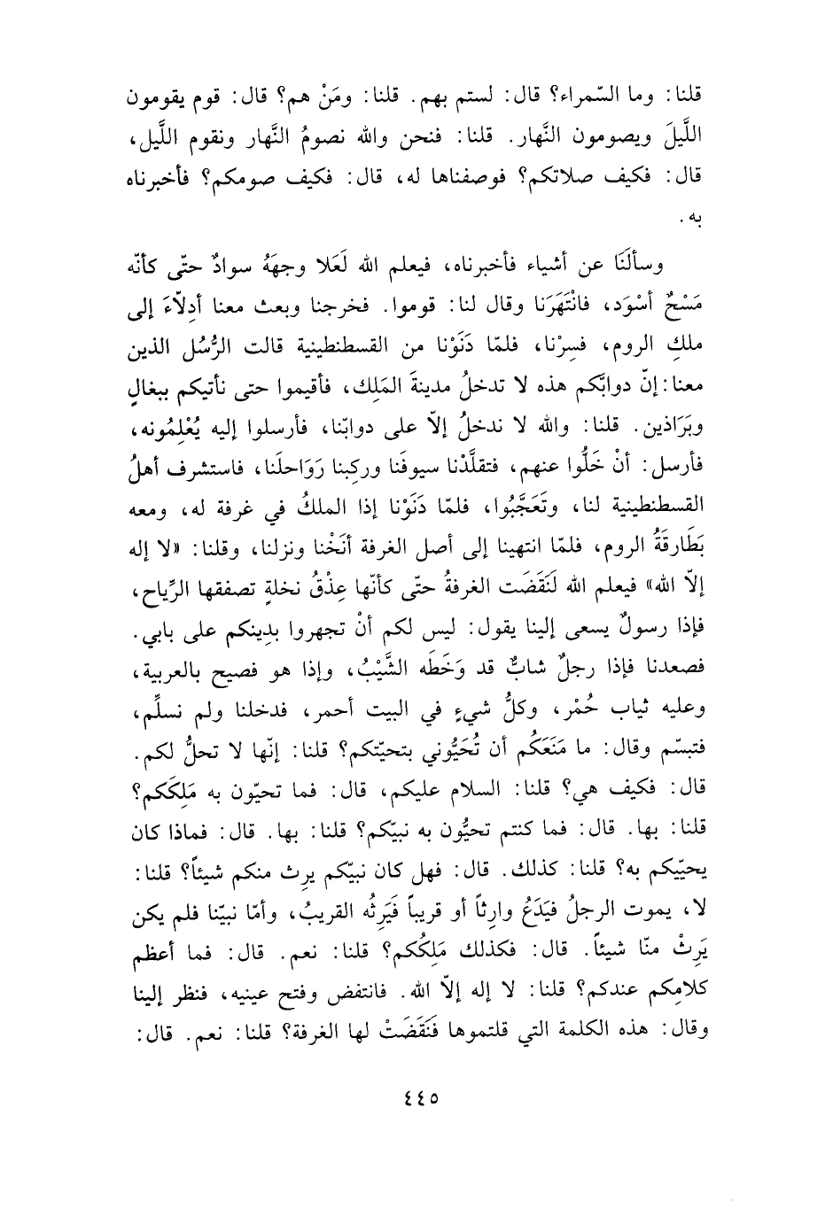 وسألنا عن أشياء فأخبرناه، فيعلم الله لعلا وجهه سواد حتى كأنه مسح أسود، فانتهرنا وقال لنا: قوموا فخرجنا وبعث معنا أدلاء إلى ملك الروم، فسرنا فلما دنونا من القسطنطينية قالت الرسل الذين معنا: إن دوابكم هذه لا تدخل مدينة الملك، فأقيموا حتى نأتيكم ببغال وبراذين. قلنا: والله لا ندخل إلا على دوابنا، فأرسلوا إليه يعلمونه، فأرسل: أن خلوا عنهم فتقلدنا سيوفنا وركبنا رواحلنا، فاستشرف أهل القسطنطينية لنا، وتعجبوا، فلما دنونا إذا الملك في غرفة له، ومعه بطارقة الروم، فلما انتهينا إلى أصل الغرفة أنخنا ونزلنا وقلنا: "لا إله إلا الله" فيعلم الله لنقضت الغرفة حتى كأنها عذق نخلة تصفقها الرياح، فإذا رسول يسعى إلينا يقول: ليس لكم أن تجهروا بدينكم على بابي. فصعدنا فإذا رجل شاب قد وخطه الشيب، وإذا هو فصيح بالعربية، وعليه ثياب حمر، وكل شيء في البيت أحمر، فدخلنا ولم نسلم، فتبسم وقال: ما منعكم أن تحيوني بتحيتكم؟ قلنا: إنها لا تحل لكم قال: فكيف هي؟ قلنا: السلام عليكم، قال: فما تحيون به ملككم؟ قلنا: بها.