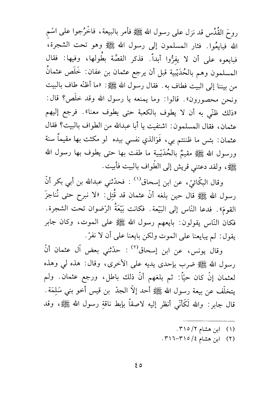روح القدس قد نزل على رسول الله صلى الله عليه وسلم فأمر بالبيعة، فاخرجوا على اسم الله فبايعوا. فثار المسلمون إلى رسول الله صلى الله عليه وسلم وهو تحت الشجرة، فبايعوه على أن لا يفروا أبدا. فذكر القصة بطولها، وفيها: فقال المسلمون وهم بالحديبية قبل أن يرجع عثمان بن عفان: خلص عثمان من بيننا إلى البيت فطاف به. فقال رسول الله صلى الله عليه وسلم: "ما أظنه طاف بالبيت ونحن محصورون". قالوا: وما يمنعه يا رسول الله وقد خلص؟ قال: "ذلك ظني به أن لا يطوف بالكعبة حتى يطوف معنا". فرجع إليهم عثمان، فقال المسلمون: اشتفيت يا أبا عبد الله من الطواف بالبيت؟