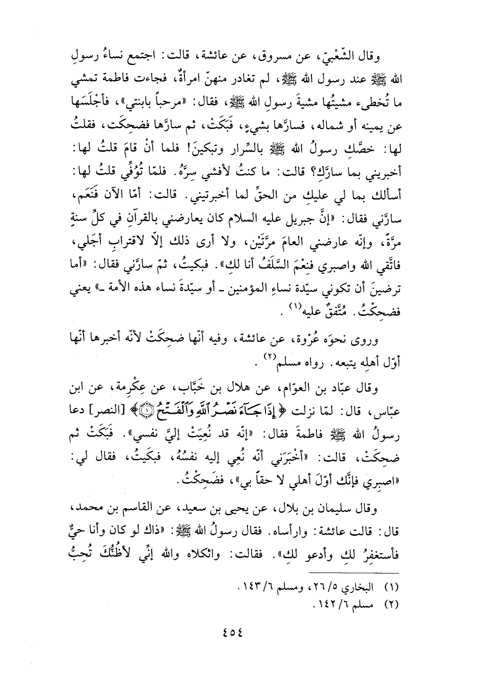 {إِذَا جَاءَ نَصْرُ اللَّهِ وَالْفَتْح} [النصر: 1] ، دعا رسول الله صلى الله عليه وسلم فاطمة فقال: "إنه قد نعيت إلي نفسي". فبكت ثم ضحكت، قالت: "أخبرني أنه نعي إليه نفسه فبكيت"، فقال لي: "اصبري فإنك أول أهلي لاحقا بي"، فضحكت.