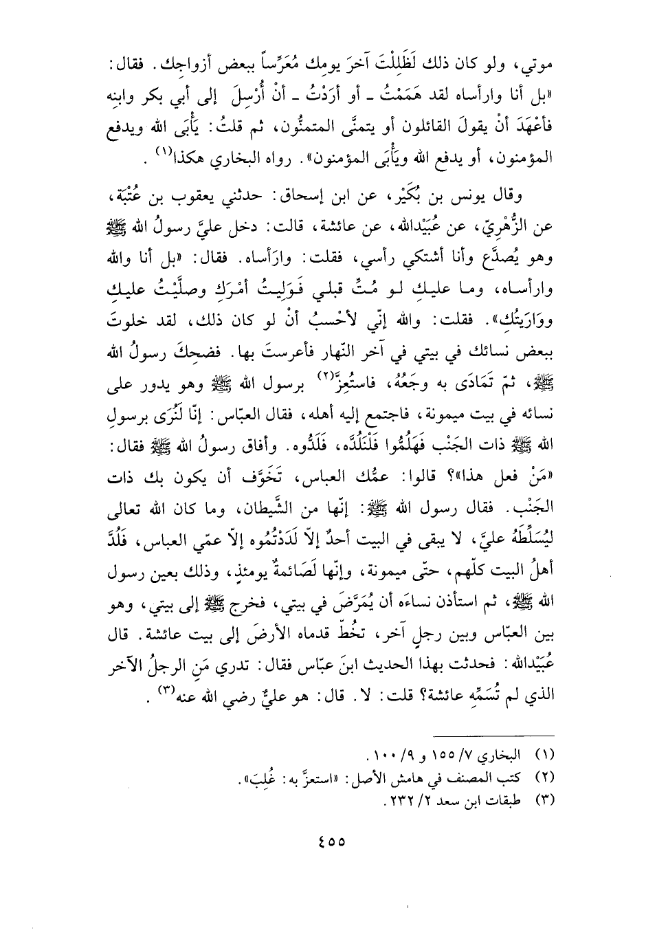 وقال يونس بن بكير، عن ابن إسحاق: حدثني يعقوب بن عتبة، عن الزهري، عن عبيد الله، عن عائشة، قالت: دخل علي رسول الله صلى الله عليه وسلم وهو يصدع وأنا أشتكي رأسي، فقلت: وارأساه. فقال: "بل أنا والله وارأساه، وما عليك لو مت قبلي فوليت أمرك وصليت عليك وواريتك". فقلت: والله إني لأحسب أن لو كان ذلك، لقد خلوت ببعض نسائك في بيتي في آخر النهار فأعرست بها، فضحك رسول الله صلى الله عليه وسلم، ثم تمادى به وجعه، فاستعز برسول الله صلى الله عليه وسلم وهو يدور على نسائه في بيت ميمونة، فاجتمع إليه أهله، فقال العباس: إنا لنرى برسول الله صلى الله عليه وسلم ذات الجنب فهلموا فلنلده، قلدوه، وأفاق رسول الله صلى الله عليه وسلم فقال: "من فعل هذا"؟ قالوا: عمك العباس، تخوف أن يكون بك ذات الجنب، فقال رسول الله صلى الله عليه وسلم: "إنها من الشيطان، وما كان الله تعالى ليسلطه علي، لا يبقى في البيت أحد إلا لددتموه إلا عمي العباس"، فلد أهل البيت كلهم، حتى ميمونة، وإنها لصائمة يومئذ، وذلك بعين رسول الله صلى الله عليه وسلم، ثم استأذن نساءه أن يمرض في بيتي، فخرج صلى الله عليه وسلم إلى بيتي، وهو بين العباس وبين رجل آخر، تخط قدماه الأرض إلى بيت عائشة، قال عبيد الله: فحدثت بهذا الحديث ابن عباس فقال: تدري من الرجل الآخر الذي لم تسمه عائشة؟ قلت: لا قال: هو علي رضي الله عنه.