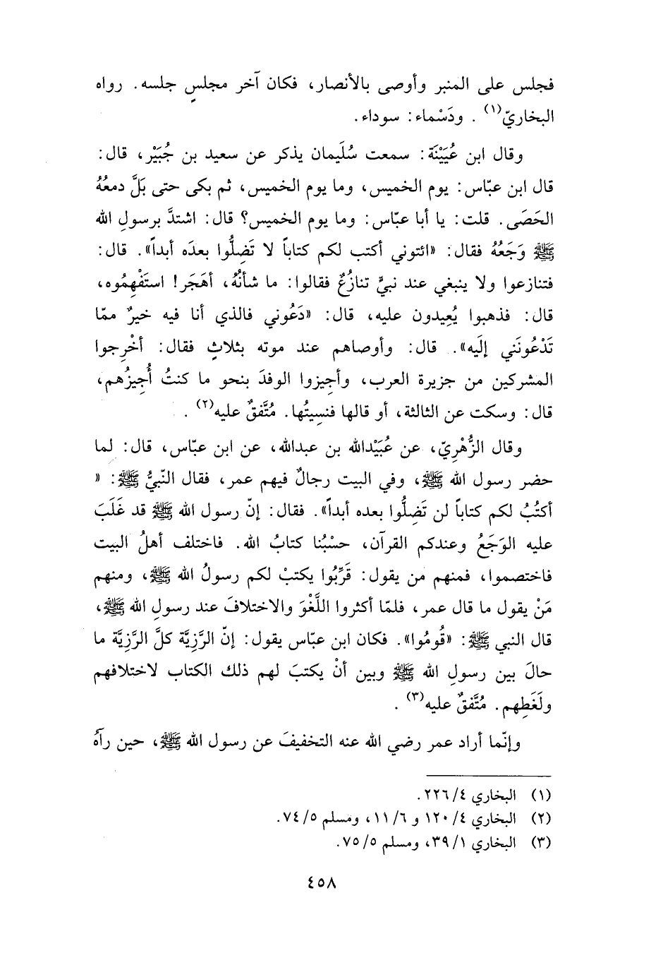 وقال ابن عيينة: سمعت سليمان يذكر عن سعيد بن جبير، قال: قال ابن عباس: يوم الخميس، وما يوم الخميس، ثم بكى حتى بل دمعه الحصى قلت: يا أبا عباس: وما يوم الخميس؟ قال: اشتد برسول الله صلى الله عليه وسلم وجعه فقال: "ائتوني أكتب لكم كتابا لا تضلوا بعده أبدا". قال: فتنازعوا ولا ينبغي عند نبي تنازع فقالوا: ما شأنه، أهجر؟! استفهموه، قال: فذهبوا يعيدون عليه، قال: "دعوني فالذي أنا فيه خير مما تدعونني إليه" قال: وأوصاهم عند موته بثلاث فقال: أخرجوا المشركين من جزيرة العرب، وأجيزوا الوفد بنحو ما كنت أجيزهم، قال: وسكت عن الثالثة، أو قالها فنسيتها. متفق عليه.