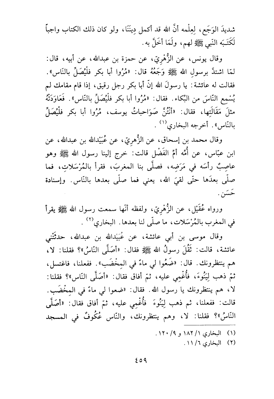 وقال يونس، عن الزهري، عن حمزة بن عبد الله، عن أبيه، قال: لما اشتد برسول الله صلى الله عليه وسلم وجعه قال: "مروا أبا بكر فليصل بالناس". فقالت له عائشة: يا رسول الله إن أبا بكر رجل رقيق، إذا قام مقامك لم يسمع الناس من البكاء. فقال: "مروا أبا بكر فليصل بالناس". فعاودته مثل مقالتها فقال: "أنتن صواحبات يوسف مروا أبا بكر فليصل بالناس". أخرجه البخاري.
