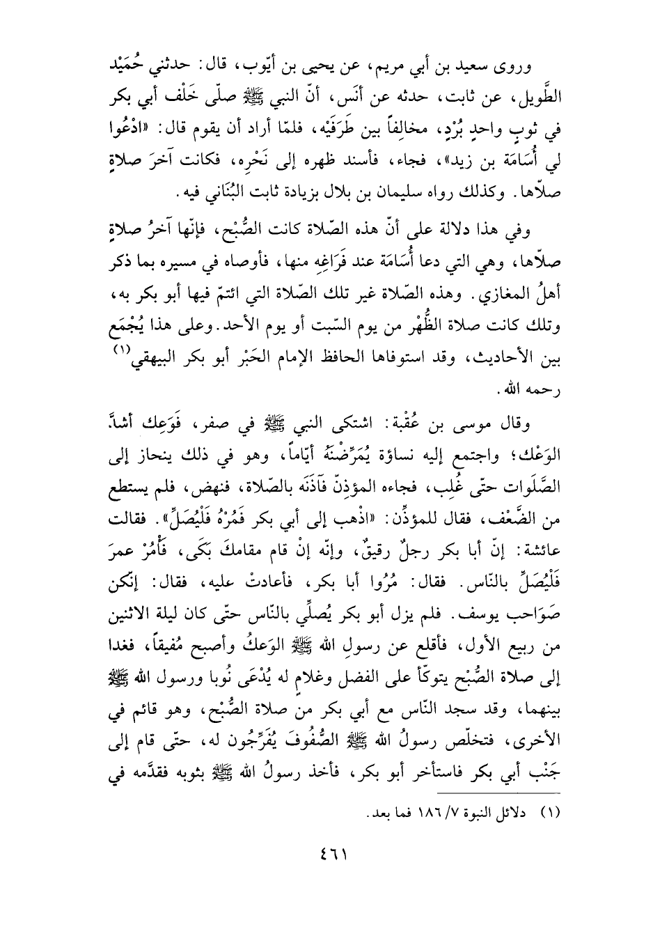 وروى سعيد بن أبي مريم، عن يحيى بن أيوب، قال: حدثني حميد الطويلن عن ثابت، حدثه عن أنس، أن النبي صلى الله عليه وسلم صلى خلف أبي بكر في ثوب واحد برد، مخالفا بين طرفيه، فلما أراد أن يقوم قال: "ادعوا لي أسامة بن زيد"، فجاء فأسند ظهره إلى نحره، فكانت آخر صلاة صلاها. وكذلك رواه سليمان بن بلال بزيادة ثابت البناني فيه.