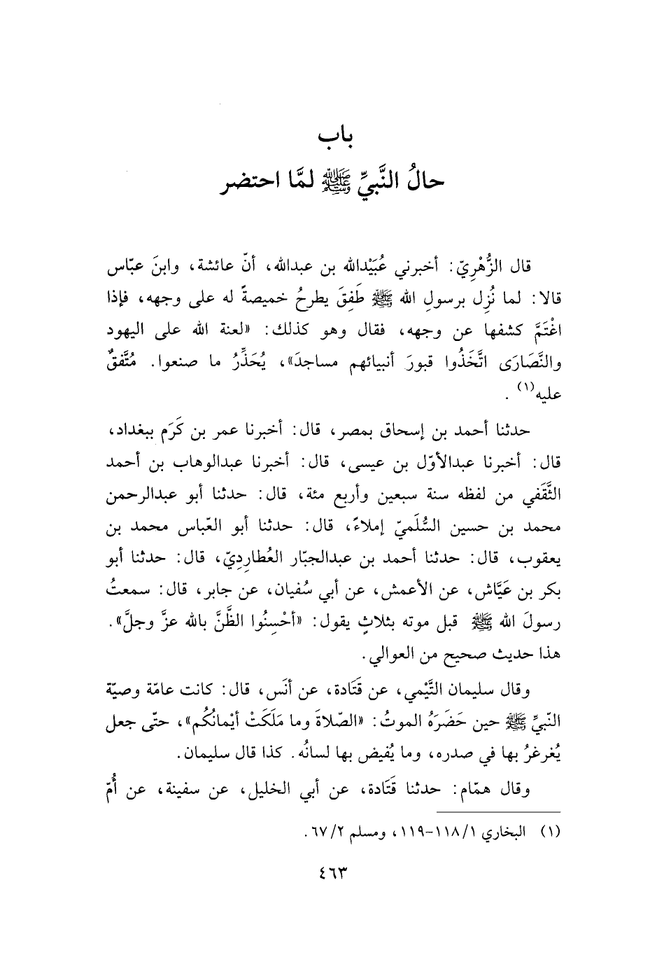 قال الزهري: أخبرني عبيد الله بن عبد الله، أن عائشة، وابن عباس قالا: لما نزل برسول الله صلى الله عليه وسلم طفق يطرح خميصة له على وجهه، فإذا اغتم كشفها عن وجهه، فقال وهو كذلك: "لعنة الله على اليهود والنصارى اتخذوا قبور أنبيائهم مساجد". يحذر ما صنعوا. متفق عليه.