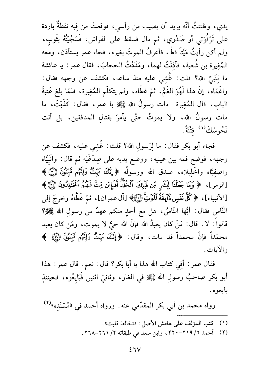 يدي وظننت أنه يريد أن يصيب من رأسي، فوقعت من فيه نقطة باردة على ترقوتي أو صدري، ثم مال فسقط على الفراش، فسجيته بثوب، ولم أكن رأيت ميتا قط، فأعرف الموت بغيره، فجاء عمر يستأذن ومعه المغيرة بن شعبة، فأذنت لهما، ومددت الحجاب، فقال عمر: يا عائشة ما لنبي الله؟ قلت: غشي عليه منذ ساعة، فكشف عن وجهه فقال: واغماه، إن هذا لهو الغم، ثم غطاه، ولم يتكلم المغيرة، فلما بلغ عتبة الباب، قال المغيرة: مات رسول الله صلى الله عليه وسلم يا عمر، فقال: كذبت، ما مات رسول الله، ولا يموت حتى يأمر بقتال المنافقين، بل أنت تحوسك فتنة.