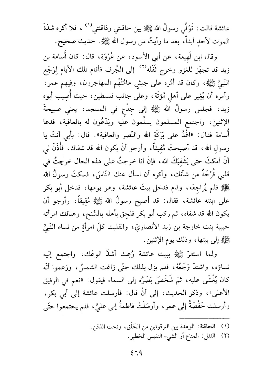 ولما استقر صلى الله عليه وسلم ببيت عائشة وعك أشد الوعك، واجتمع إليه نساؤه، واشتد وجعه، فلم يزل بذلك حتى زاغت الشمس، وزعموا أنه كان يغشى عليه، ثم شخص بصره إلى السماء فيقول: "نعم في الرفيق الأعلى"، وذكر الحديث إلى أن قال: فأرسلت عائشة إلى أبي بكر، وأرسلت حفصة إلى عمر، وارسلت فاطمة إلى علي، فلم يجتمعوا حتى