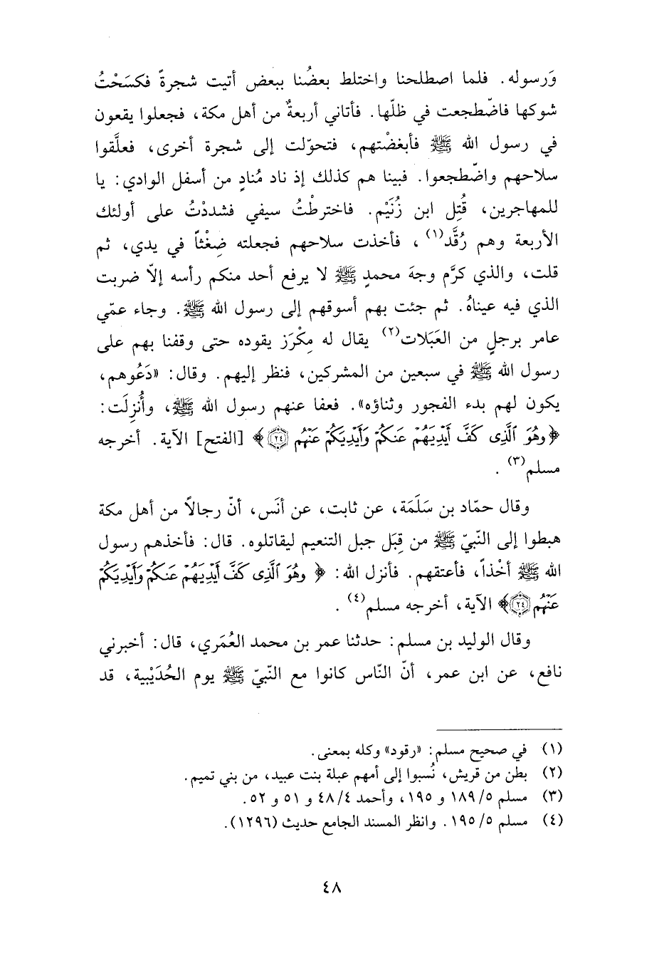 ورسوله. فلما اصطلحنا واختلط بعضنا ببعض أتيت شجرة فكسحت شوكها فاضطجعت في ظلها. فأتاني أربعة من أهل مكة، فجعلوا يقعون في رسول الله صلى الله عليه وسلم فأبغضتهم، فتحولت إلى شجرة أخرى، فعلقوا سلاحهم واضطجعوا. فبينا هم كذلك إذ ناد مناد من أسفل الوادي: يا للمهاجرين، قتل ابن زنيم. فاخترطت سيفي فشددت على أولئك الأربعة وهم رقد، فأخذت سلاحهم فجعلته ضغثا في يدي، ثم قلت: والذي كرم وجه محمد صلى الله عليه وسلم لا يرفع أحد منكم إلا ضربت الذي فيه عيناه، ثم جئت بهم أسوقهم إلى رسول الله صلى الله عليه وسلم. وجاء عمي عامر برجل من العبلات يقال له: مكرز يقوده حتى وقفنا بهم على
