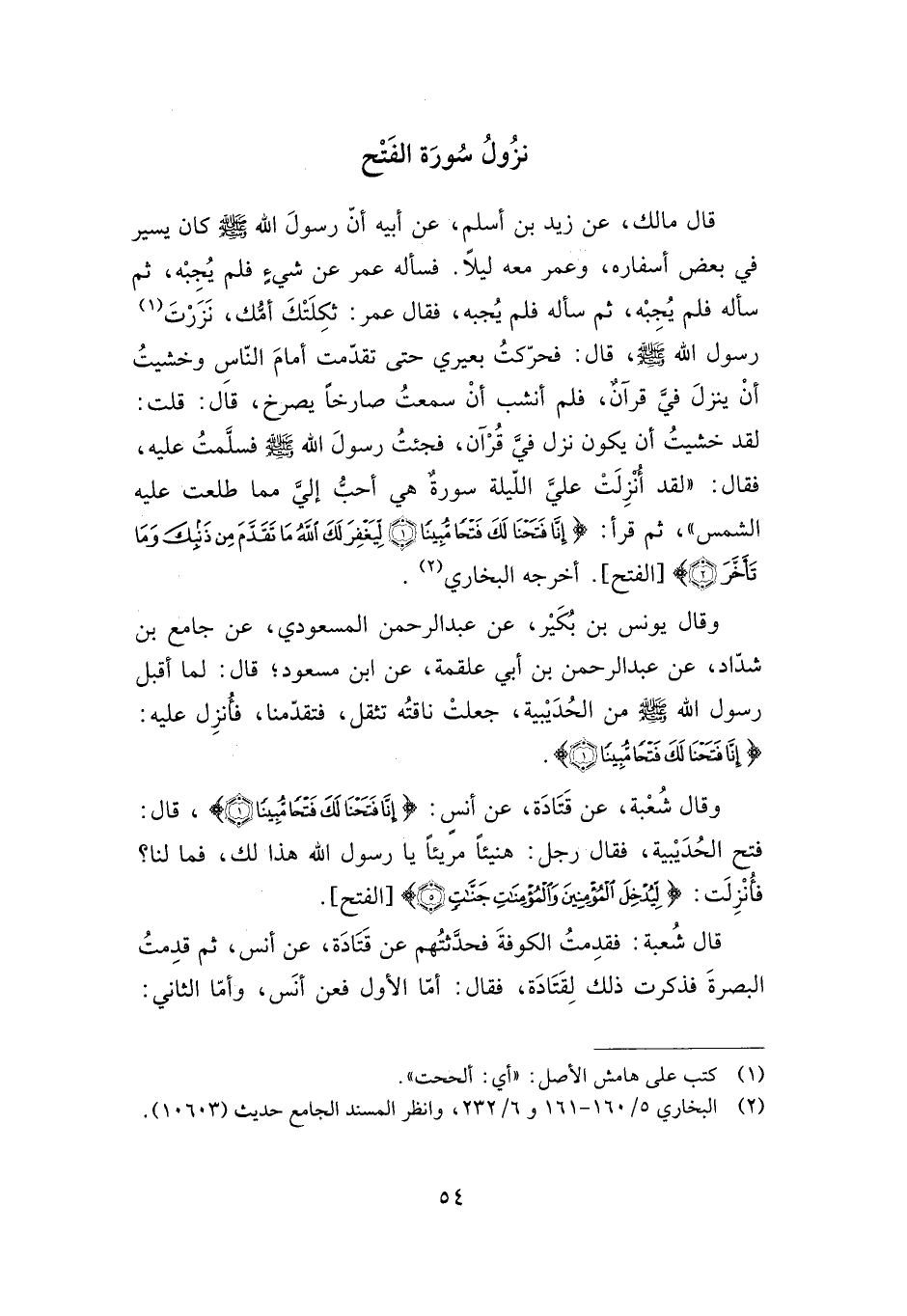 قال مالك، عن زيد بن أسلم، عن أبيه أن رسول الله -صلى الله عليه وسلم- كان يسير في بعض أسفاره، وعمر معه ليلا. فسأله عمر عن شيء فلم يجبه، ثم سأله فلم يجيه، ثم سأله فلم يجبه، فقال عمر: ثكلتك أمك، نزرت رسول الله -صلى الله عليه وسلم، قال: فحركت بعيري حتى تقدمت أمام الناس وخشيت أن ينزل في قرآن، فلم أنشب أن سمعت صارخا يصرخ، قال: قلت: لقد خشيت أن يكون نزل في قرآن، فجئت رسول الله -صلى الله عليه وسلم- فسلمت عليه، فقال: "لقد أنزلت علي الليلة سورة هي أحب إلي مما طلعت عليه الشمس"، ثم قرأ: {إِنَّا فَتَحْنَا لَكَ فَتْحًا مُبِينًا، لِيَغْفِرَ لَكَ اللَّهُ مَا تَقَدَّمَ مِنْ ذَنْبِكَ وَمَا تَأَخَّرَ} [الفتح] ، أخرجه البخاري.