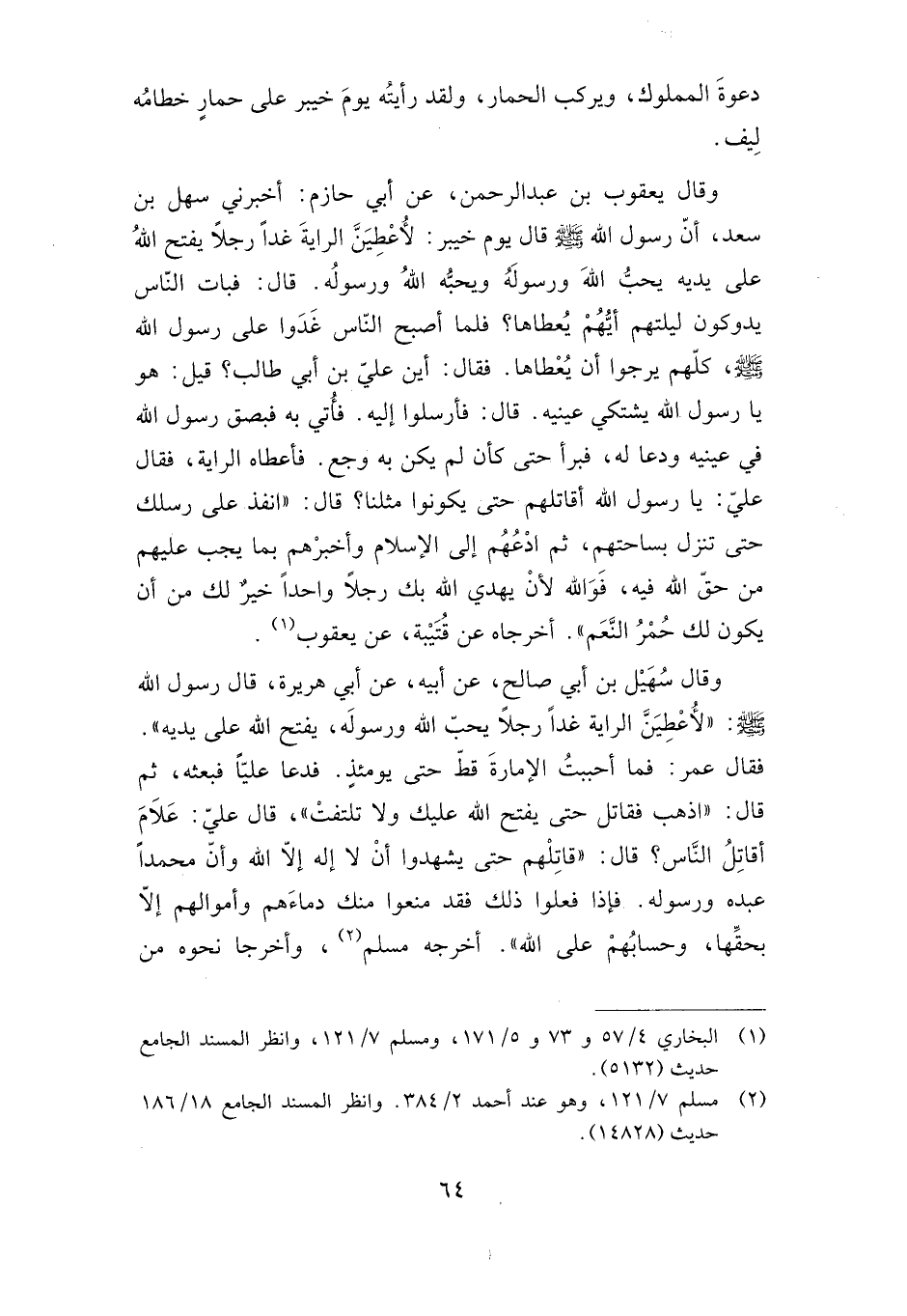 وقال يعقوب بن عبد الرحمن، عن أبي حازم: أخبرني سهل بن سعد، أن رسول الله -صلى الله عليه وسلم- قال يوم خيبر: "لأعطين الراية غدا رجلا يفتح الله على يديه يحب الله ورسوله ويحبه الله ورسوله". قال: فبات الناس يدوكون ليلتهم أيهم يعطاها؟ فلما أصبح الناس غدوا على رسول الله -صلى الله عليه وسلم-، كلهم يرجوا أن يعطاها. فقال: "أين علي بن أبي طالب"؟ قيل: هو يا رسول الله يشتكي عينيه. قال: فأرسلوا إليه. فأتي به فبصق رسول الله في عينيه ودعا له، فبرأ حتى كان لم يكن به وجع. فأعطاه الراية، فقال علي: يا رسول الله أقاتلهم حتى يكونوا مثلنا؟ قال: "انفذ على رسلك حتى تنزل بساحتهم، ثم ادعهم إلى الإسلام وأخبرهم بما يجب عليهم من حق الله فيه، فوالله لأن يهدي الله بك رجلا واحدا خير لك من أن يكون لك حمر النعم". أخرجه عن قتيبة، عن يعقوب.