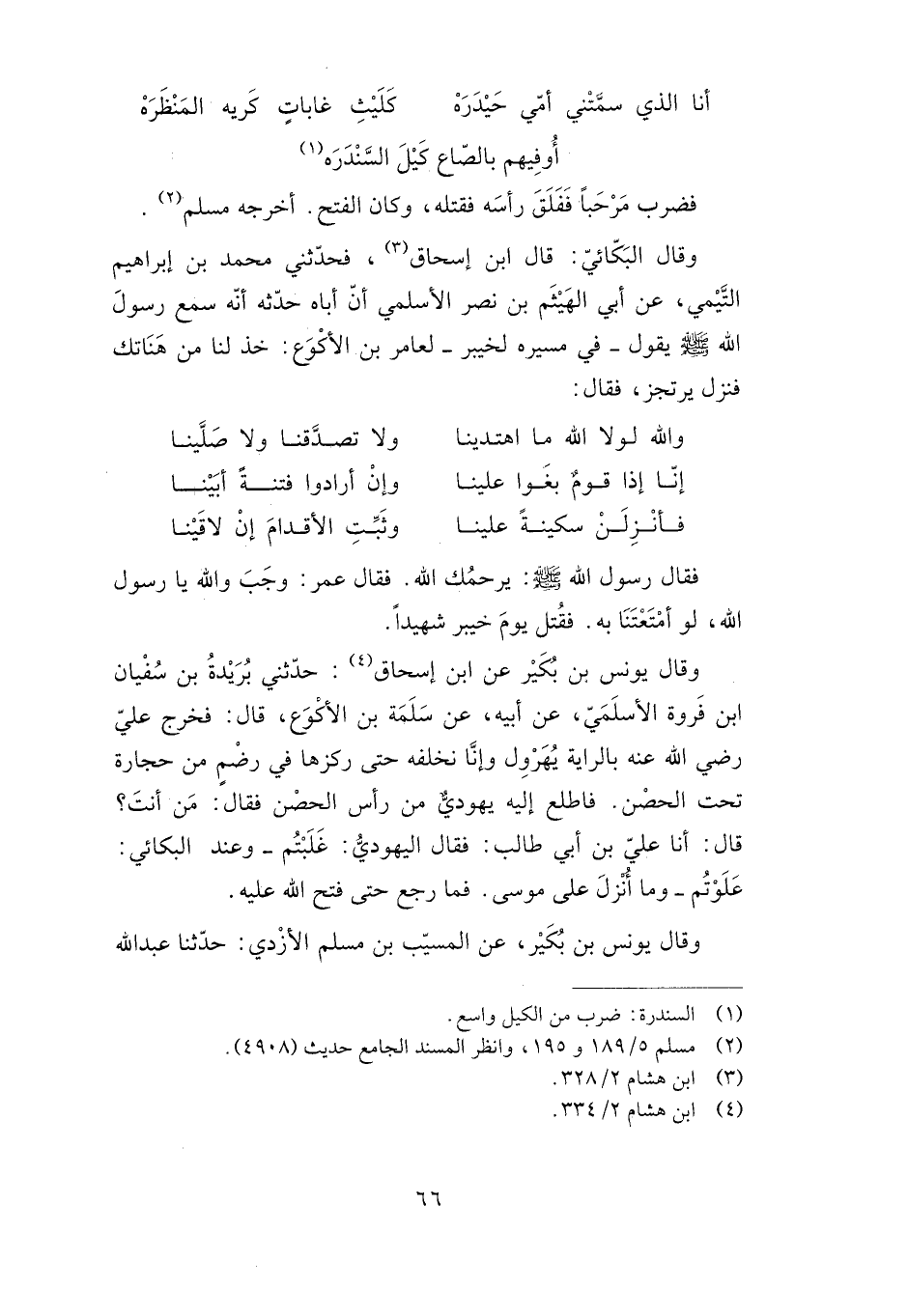 وقال البكائي: قال ابن إسحاق، فحدثني محمد بن إبراهيم التيمي، عن أبي الهيثم بن نصر الأسلمي أن أباه حدثه أنه سمع رسول الله -صلى الله عليه وسلم- يقول -في مسيره لخيبر- لعامر بن الأكوع: خذ لنا من هناتك فنزل يرتجز، فقال: