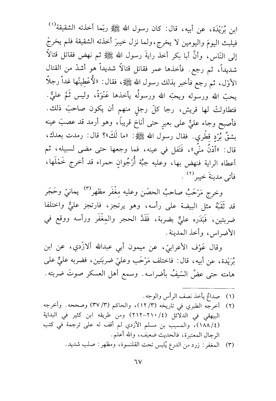 بن بريدة، عن أبيه، قال: كان رسول الله -صلى الله عليه وسلم: ربما أخذته الشقيقة فيلبث اليوم واليومين لا يخرج، ولما نزل خيبر أخذته الشقيقة فلم يخرج إلى الناس، وأن أبا بكر أخذ راية رسول الله -صلى الله عليه وسلم- ثم نهض فقاتل قتالا شديدا، ثم رجع. فأخذها عمر فقاتل قتالا شديدا هو أشد من القتال الأول، ثم رجع فأخبر بذلك رسول الله -صلى الله عليه وسلم-، فقال: "لأعطينها غدا رجلا يحب الله ورسوله ويحبه الله ورسوله يأخذها عنوة"، وليس ثم علي. فتطاولت لها قريش، رجاكل رجل منهم أن يكون صاحب ذلك. فأصبح وجاء علي على بعير حتى أناخ قريبا، وهو أرمد قد عصب عينه بشق برد قطري. فقال رسول الله -صلى الله عليه وسلم: "ما لك"؟ قال: رمدت بعدك، قال: "ادن مني"، فتفل في عينه، فما وجعها حتى مضى لسبيله، ثم أعطاه الراية فنهض بها، وعليه جبة أرجوان حمراء قد أخرج خملها، فأتى مدينة خيبر.