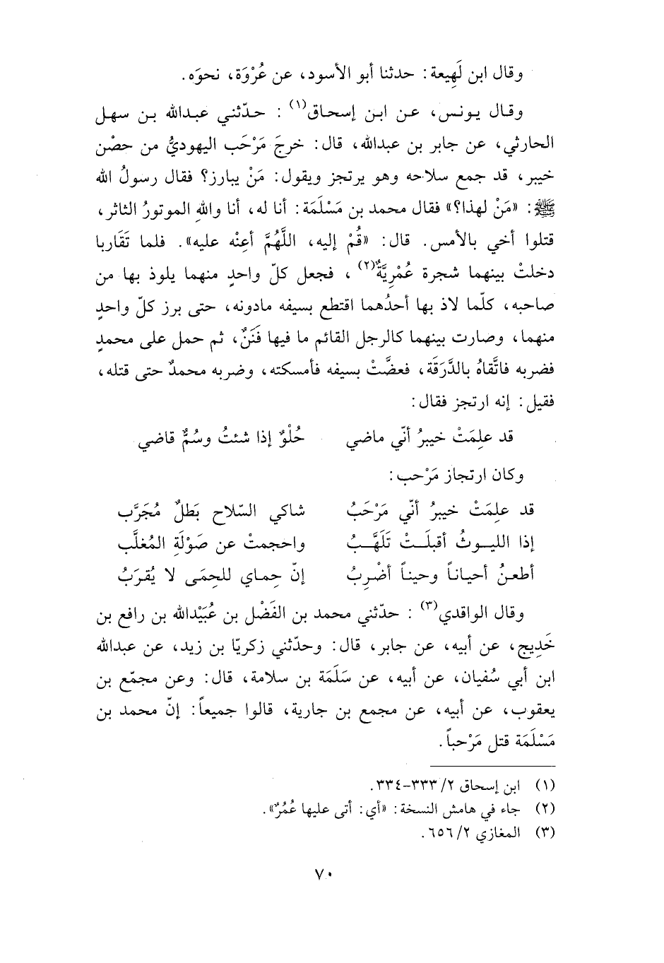 وقال الواقدي: حدثني محمد بن الفضل بن عبيد الله بن رافع بن خديج، عن أبيه، عن جابر، قال: وحدثني زكريا بن زيد، عن عبد الله بن أبي سفيان، عن أبيه، عن سلمة بن سلامة، قال: وعن مجمع بن يعقوب، عن أبيه، عن مجمع بن جارية، قالوا جميعا: إن محمد بن مسلمة قتل مرحبا.