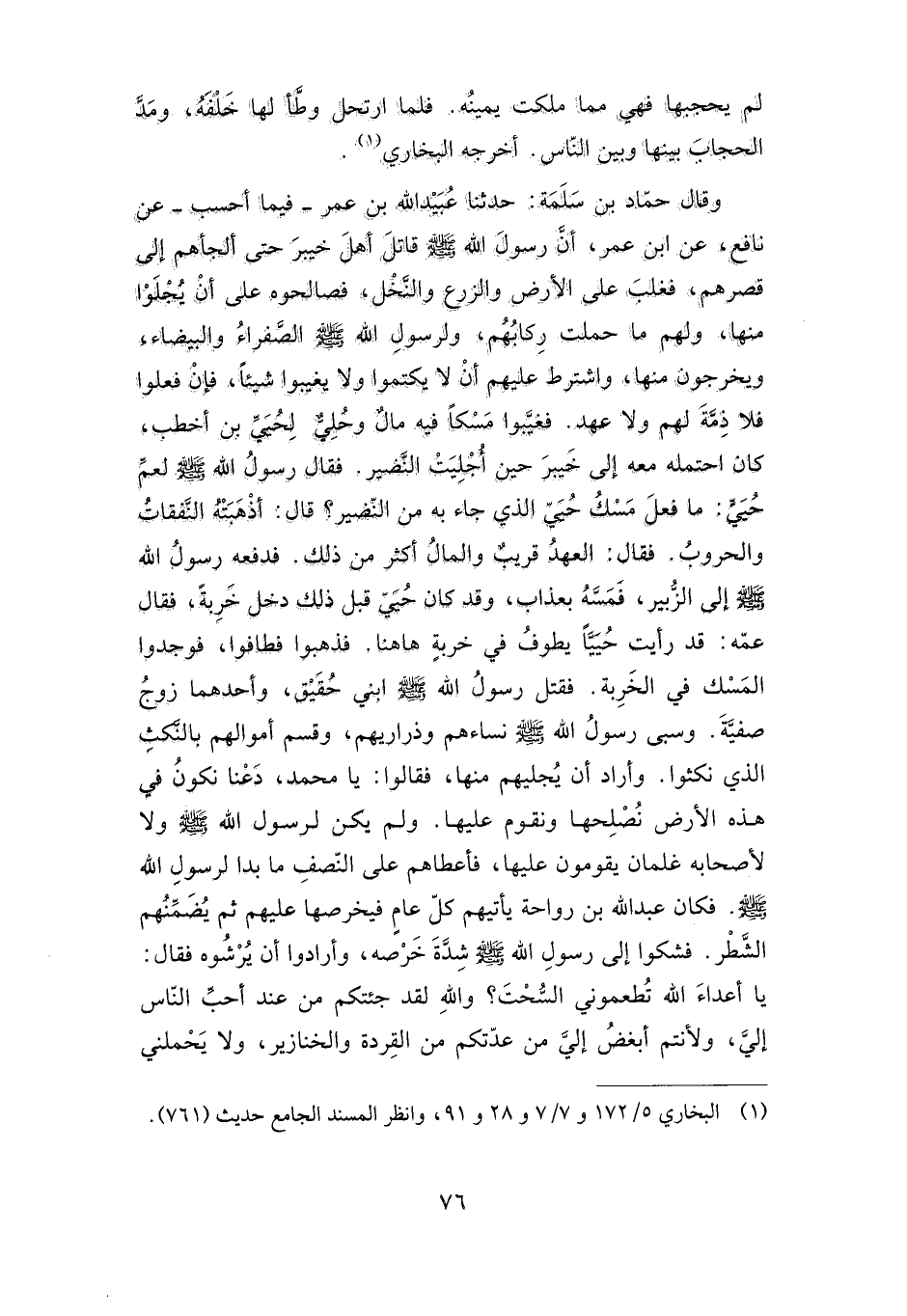 وقال حماد بن سلمة: حدثنا عبيد الله بن عمر- فيما أحسب- عن نافع عن ابن عمر، أن رسول الله -صلى الله عليه وسلم- قاتل أهل خيبر حتى ألجأهم إلى قصرهم، فغلب على الأرض والزرع والنخل، فصالحوه على أن يجلوا منها، ولهم ما حملت ركابهم، ولرسول الله -صلى الله عليه وسلم- الصفراء