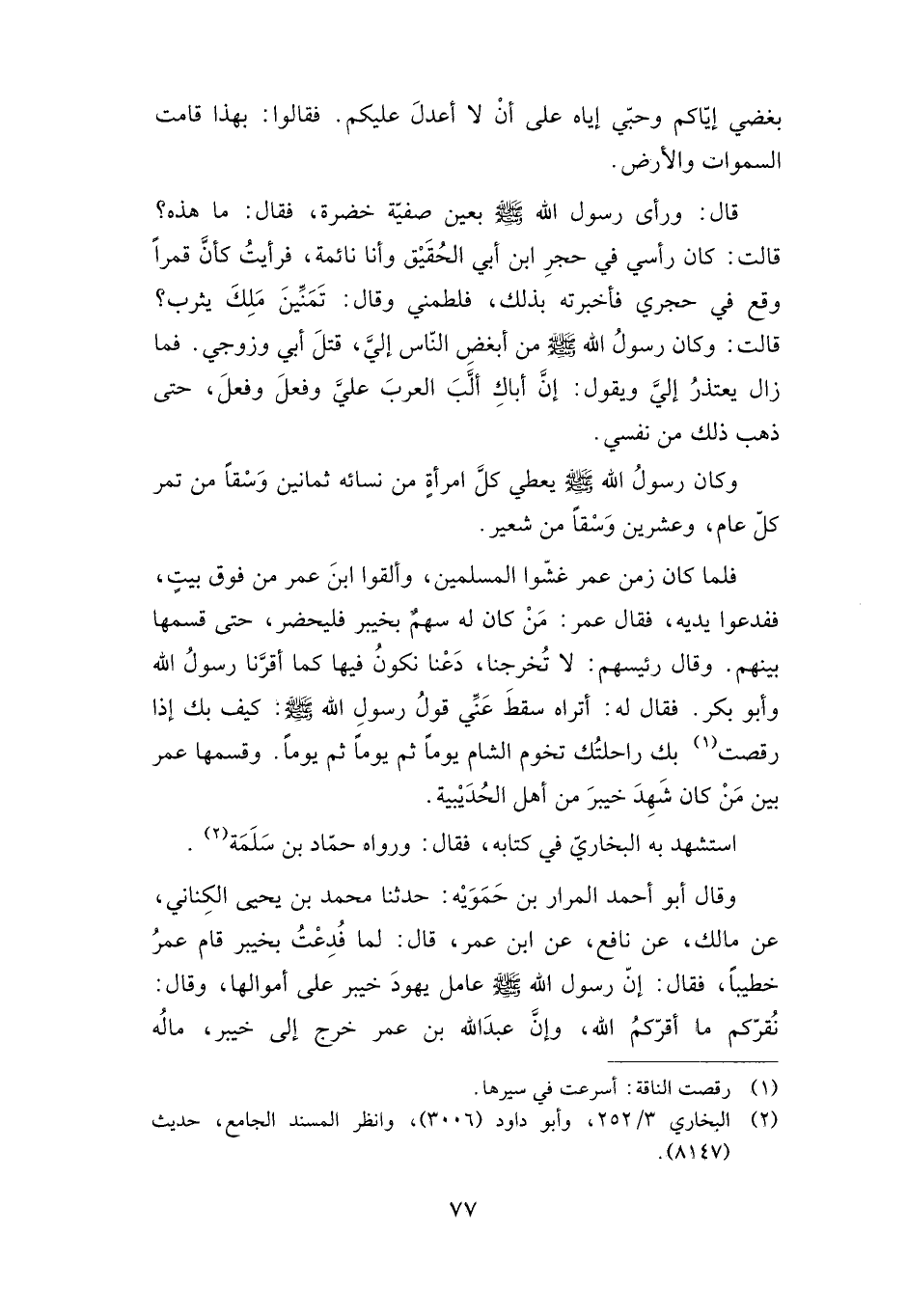 وقال أبو أحمد المرار بن حمويه: حدثنا محمد بن يحيى الكناني، عن مالك، عن نافع، عن ابن عمر، قال: لما فدعت بخيبر قام عمر خطيبا، فقال: إن رسول الله -صلى الله عليه وسلم- عامل يهود خيبر على أموالها، وقال: "نقركم ما أقركم الله"، وإن عبد الله بن عمر خرج إلى خيبر، ماله