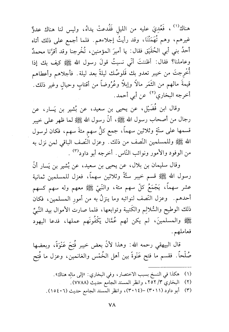 وقال ابن فضيل، عن يحيى بن سعيد، عن بشير بن يسار، عن رجال من أصحاب رسول الله -صلى الله عليه وسلم، أن رسول الله -صلى الله عليه وسلم- لما ظهر على خيبر قسمها على ستة وثلاثين سهما، جمع كل سهم مائة سهم، فكان لرسول الله -صلى الله عليه وسلم- وللمسلمين النصف من ذلك. وعزل النصف الباقي لمن نزل به من الوفود والأمور ونوائب الناس. أخرجه أبو داود.