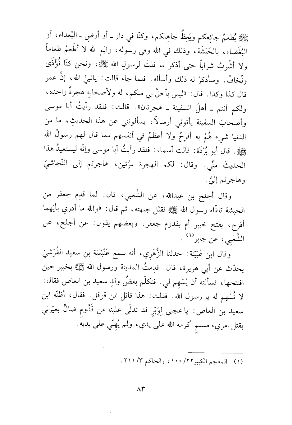 وقال أجلح بن عبد الله، عن الشعبي، قال: لما قدم جعفر من الحبشة تلقاه رسول الله -صلى الله عليه وسلم- فقبل جبهته، ثم قال: "والله ما أدري بأيهما أفرح، بفتح خيبر أم بقدوم جعفر". وبعضهم يقول: عن أجلح، عن الشعبي، عن جابر.