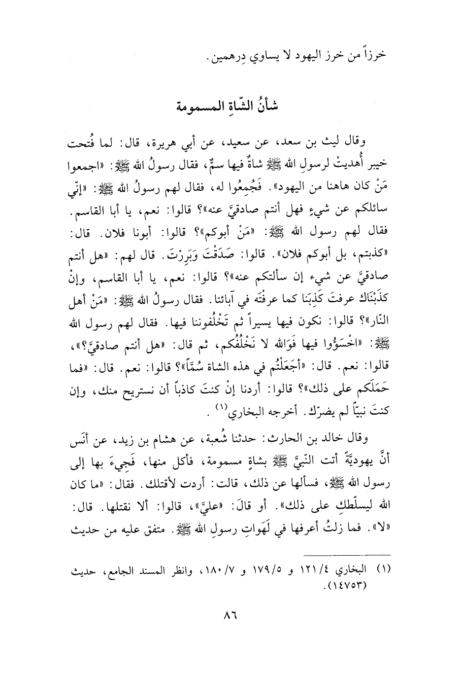 وقال ليث بن سعد، عن سعيد، عن أبي هريرة، قال: لما فتحت خيبر أهديت لرسول الله -صلى الله عليه وسلم- شاة فيها سم، فقال رسول الله -صلى الله عليه وسلم: "اجمعوا من كان ههنا من اليهود". فجمعوا له، فقال لهم رسول الله -صلى الله عليه وسلم: "إني سائلكم عن شيء فهل أنتم صادقي عنه"؟ قالوا: نعم، يا أبا القاسم. فقال لهم رسول الله -صلى الله عليه وسلم: "من أبوكم"؟ قالوا: أبونا فلان. قال: "كذبتم، بل أبوكم فلان". قالوا: صدقت وبررت. قال لهم: "هل أنتم صادقي عن شيء إن سألتكم عنه"؟ قالوا: نعم، يا أبا القاسم، وإن كذبناك عرفت كذبنا كما عرفته في آبائنا. فقال رسول الله -صلى الله عليه وسلم: "من أهل النار"؟ قالوا: نكون فيها يسيرًا ثم تخلفوننا فيها. فقال لهم رسول الله -صلى الله عليه وسلم: "اخسؤوا فيها فوالله لا نخلفكم"، ثم قال: "هل أنتم صادقي"؟، قالوا: نعم قال: "أجعلتم في هذه الشاة سما"؟ قالوا: نعم. قال: "فما حملكم على ذلك"؟ قالوا: أردنا إن كنت كاذبا أن نستريح منك، وإن كنت نبيا لم يضرك. أخرجه البخاري.