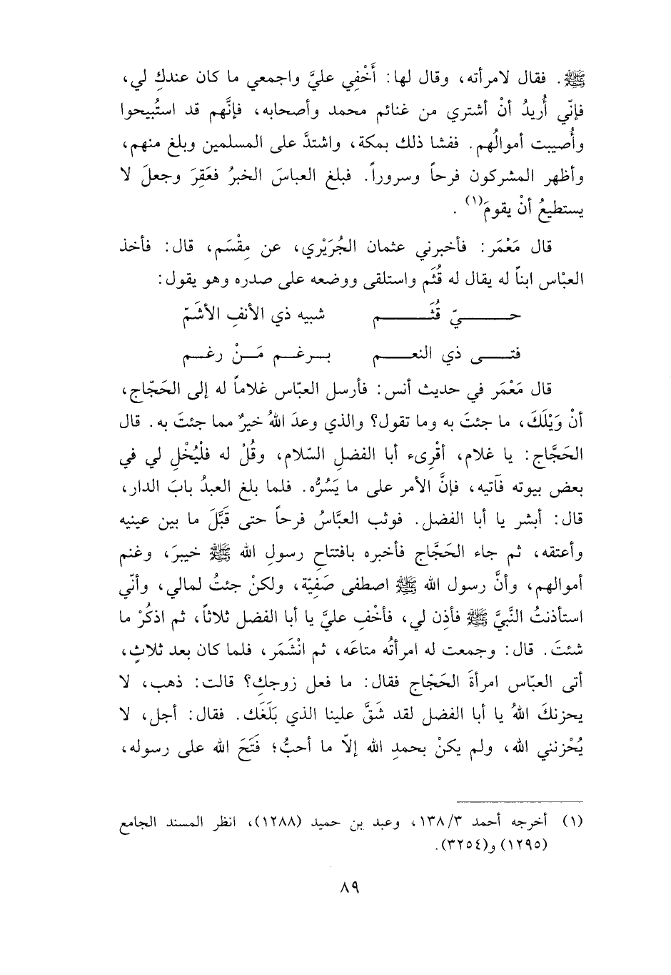 قال معمر في حديث أنس: فأرسل العباس غلاما له إلى الحجاج، أن ويلك، ما جئت به وما تقول؟ والذي وعد الله خير مما جئت به. قال الحجاج: يا غلام، أقرئ أبا الفضل السلام، وقل له: فليخل لي في بعض بيوته فآتيه، فإن الأمر على ما يسره. فلما بلغ العبد باب الدار، قال: أبشر يا أبا الفضل. فوثب العباس فرحا حتى قبل ما بين عينيه وأعتقه، ثم جاء الحجاج فأخبره بافتتاح رسول الله صلى الله عليه وسلم خيبر، وغنم أموالهم، وأن رسول الله صلى الله عليه وسلم اصطفى صفية، ولكن جئت لمالي، وأني استأذنت النبي صلى الله عليه وسلم فأذن لي، فأخف علي يا أبا الفضل ثلاثًا، ثم اذكر ما شئت. قال: وجمعت له امرأته متاعه، ثم انشمر، فلما كان بعد ثلاث، أتى العباس امرأة الحجاج فقال: ما فعل زوجك؟ قالت: ذهب، لا يحزنك الله يا أبا الفضل لقد شق علينا الذي بلغك. فقال: أجل، لا يحزنني الله، ولم يكن بحمد الله إلا ما أحب؛ فتح الله على رسوله،