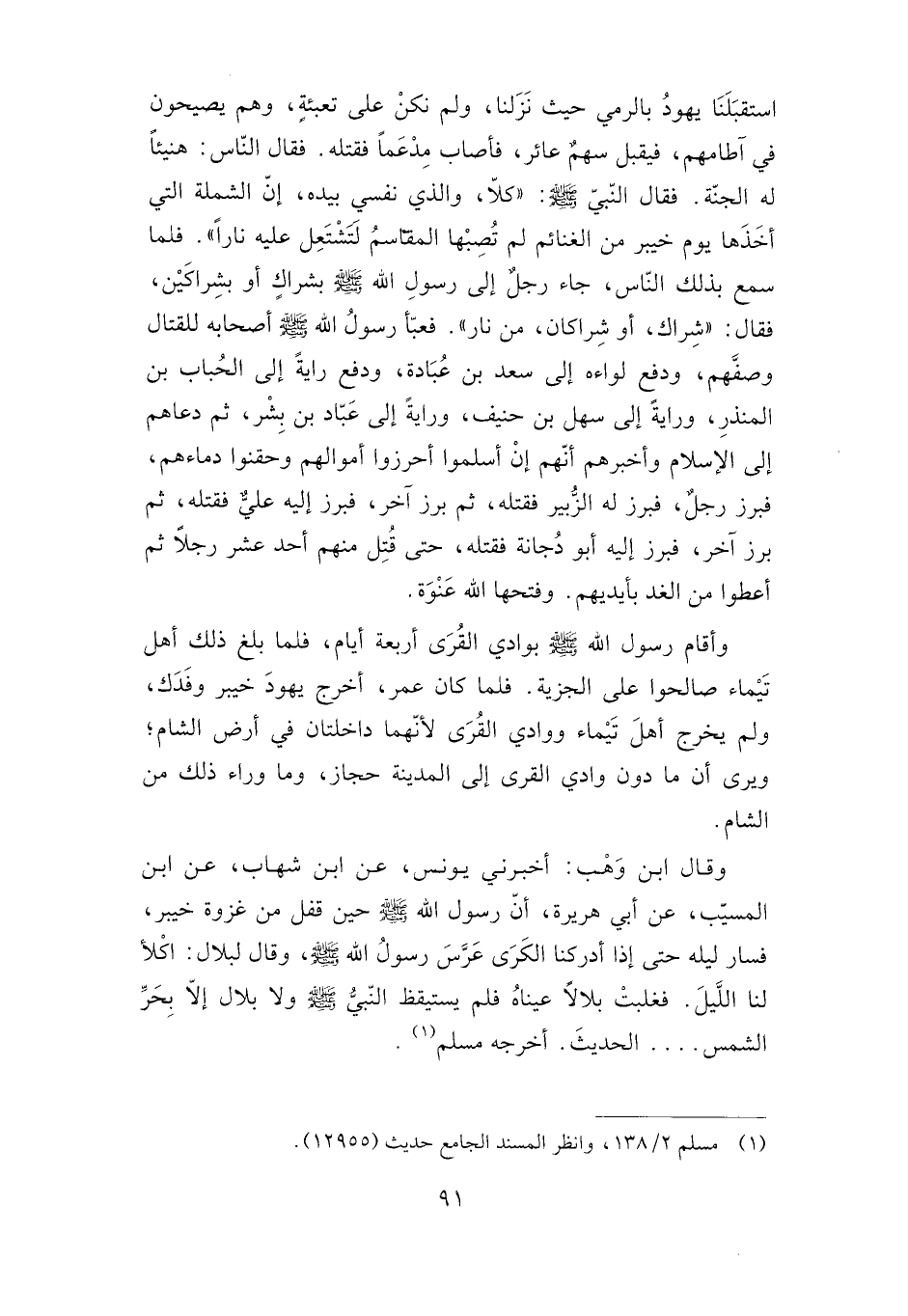 وقال ابن وهب: أخبرني يونس، عن ابن شهاب، عن ابن المسيب، عن أبي هريرة، أن رسول الله صلى الله عليه وسلم حين قفل من غزوة خيبر، فسار ليله حتى إذا أدركنا الكرى عرس رسول الله صلى الله عليه وسلم، وقال لبلال: اكلأ لنا الليل. فغلبت بلالا عيناه فلم يستيقظ النبي صلى الله عليه وسلم ولا بلال إلا بحر الشمس ... الحديث. أخرجه مسلم.