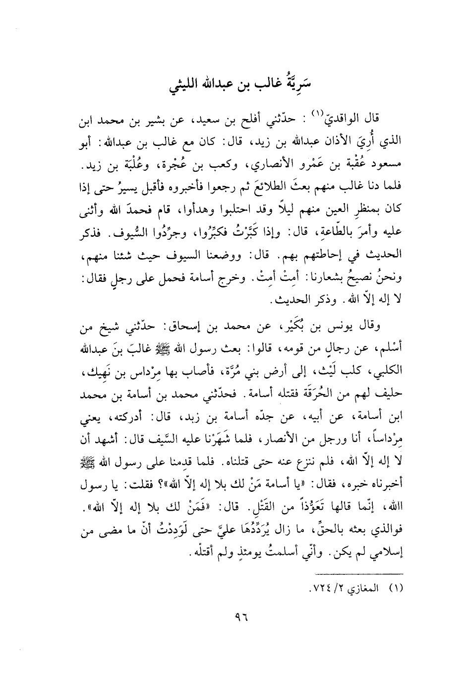قال الواقدي: حدثني أفلح بن سعيد، عن بشير بن محمد ابن الذي أري الأذان عبد الله بن زيد، قال: كان مع غالب بن عبد الله: أبو مسعود عقبة بن عمرو الأنصاري، وكعب بن عجرة، وعلبة بن زيد. فلما دنا غالب منهم بعث الطلائع ثم رجعوا فأخبروه فأقبل يسير حتى إذا كان بمنظر العين منهم ليلا وقد احتلبوا وهدأوا، قام فحمد الله وأثنى عليه وأمر بالطاعة، قال: وإذا كبرت فكبروا، وجردوا السيوف. فذكر الحديث في إحاطتهم بهم. قال: ووضعنا السيوف حيث شئنا منهم، ونحن نصيح بشعارنا: أمت أمت. وخرج أسامة فحمل على رجل فقال: لا إله إلا الله. وذكر الحديث.