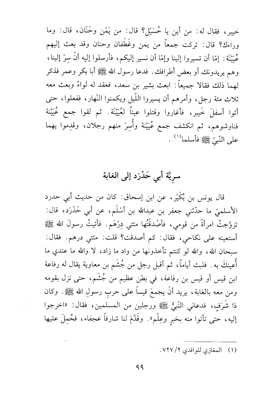 خيبر، فقال له: "من أين يا حسيل" قال: من يمن وحنان، قال: "وما وراءك"؟ قال: تركت جمعا من يمن وغطفان وحنان وقد بعث إليهم عيينة: إما أن تسيروا إلينا وإما أن نسير إليكم، فأرسلوا إليه أن سر إلينا، وهم يريدونك أو بعض أطرافك. فدعا رسول الله صلى الله عليه وسلم أبا بكر وعمر فذكر لهما ذلك فقالا جميعا: ابعث بشير بن سعد، فعقد له لواء وبعث معه ثلاث مائه رجل، وأمرهم أن يسيروا الليل ويكمنوا النهار، ففعلوا، حتى أتوا أسفل خيبر، فأغاروا وقتلوا فأغاروا وقتلوا عينا لعيينة. ثم لقوا جمع عيينة فناوشوهم، ثم انكشف جمع عيينة وأسر منهم رجلان، وقدموا بهما على النبي صلى الله عليه وسلم فأسلما.