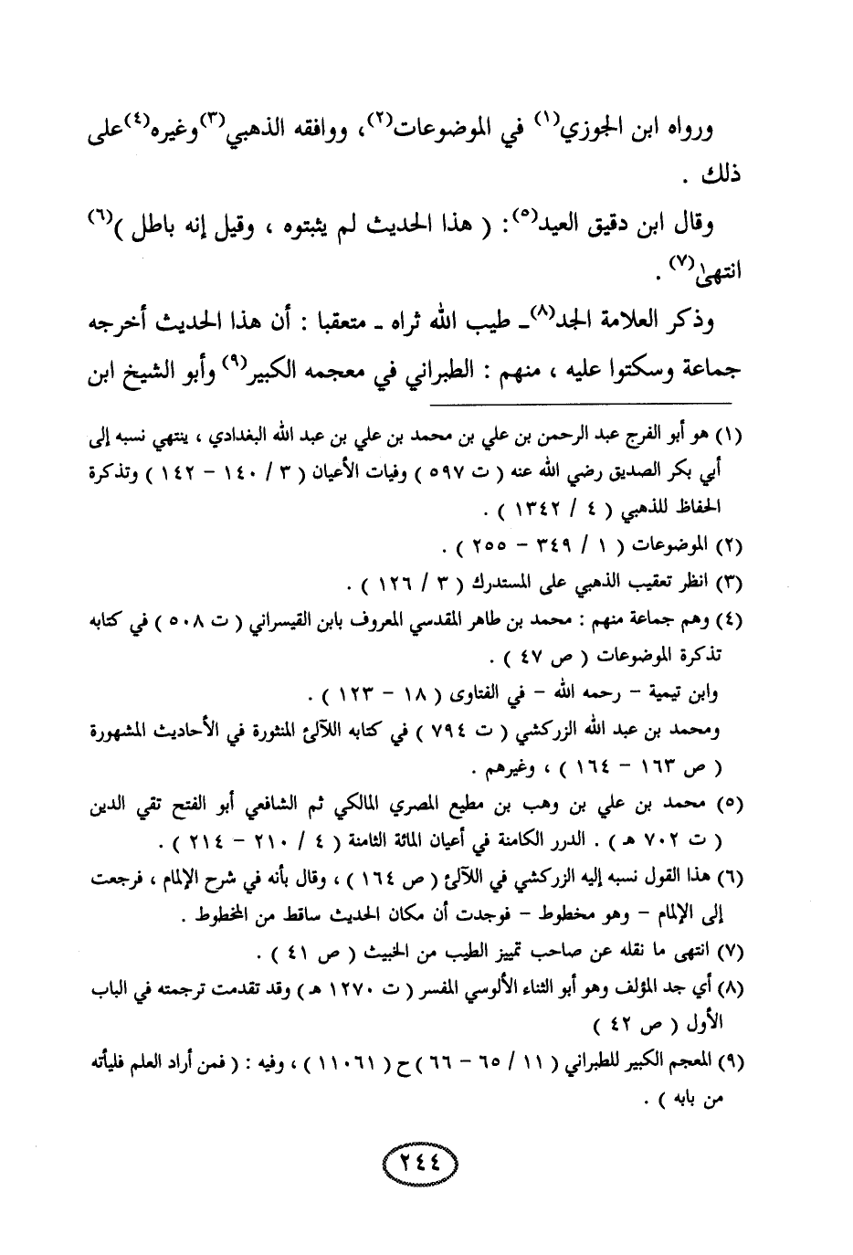 ورواه ابن الجوزي في الموضوعات، ووافقه الذهبي وغيره على ذلك. وقال ابن دقيق العيد: (هذا الحديث لم يثبتوه، وقيل: إنه باطل) انتهى.