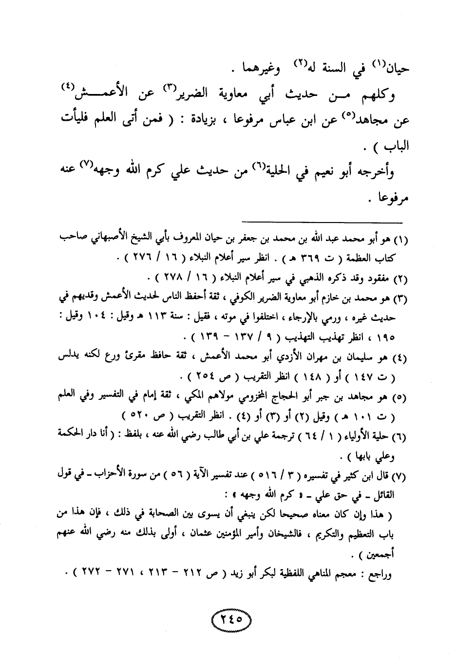 حيان في السنة له، وغيرهما. وكلهم من حديث أبي معاوية الضرير عن الأعمش عن مجاهد عن ابن عباس مرفوعا، بزيادة: (فمن أتى العلم فليأت الباب) . وأخرجه أبو نعيم في الحلية من حديث علي كرم الله وجهه عنه مرفوعا.