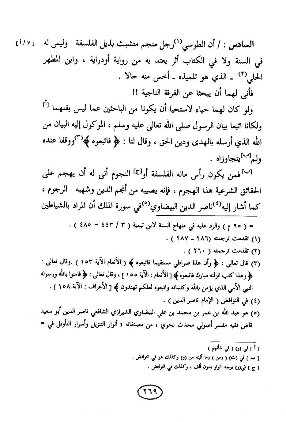 السادس: أن الطوسي رجل منجم متشبث بذيل الفلسفة وليس له في السنة ولا في الكتاب أثر يعتد به من رواية أو دراية، وابن المطهر الحلي -الذي هو تلميذه- أخس منه حالا.