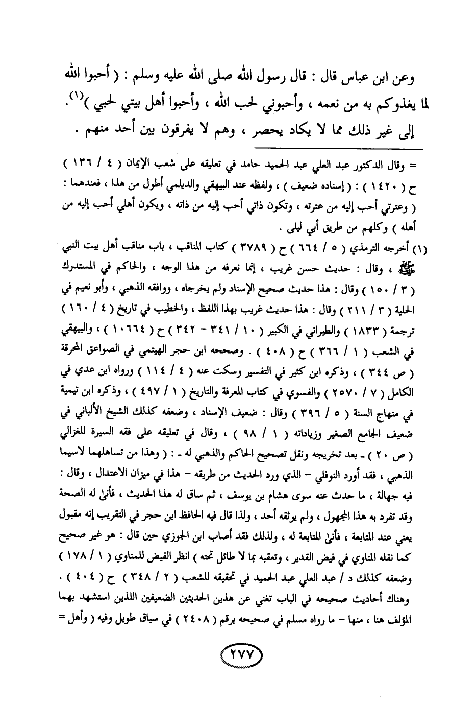 وعن ابن عباس قال: قال رسول الله 700: «أحبوا الله لما يغذوكم به من نعمه، وأحبوني لحب الله، وأحبوا أهل بيتي لحبي» .