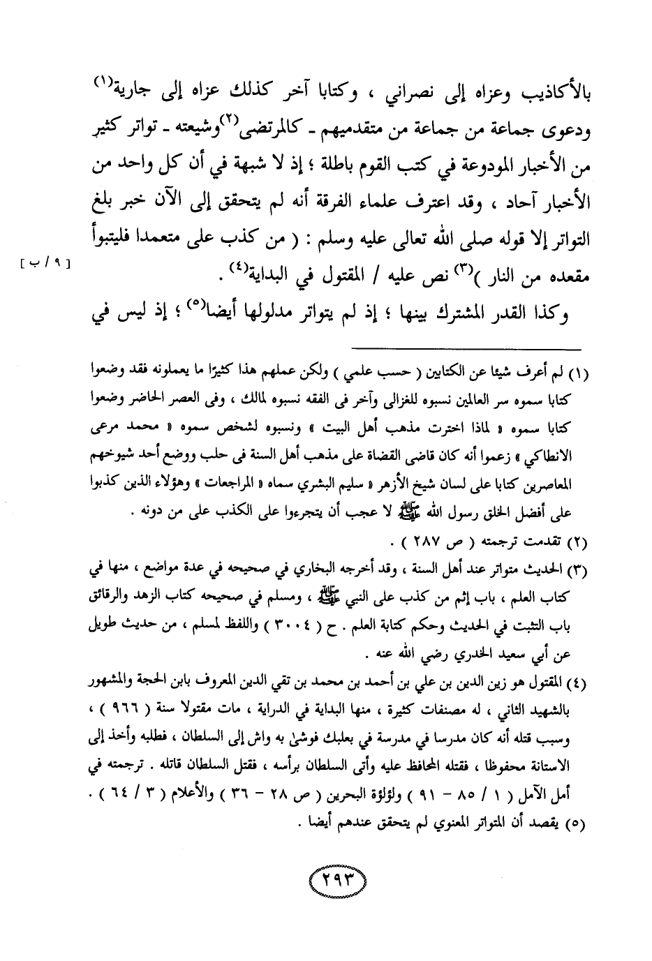 بالأكاذيب وعزاه إلى نصراني، وكتابا آخر كذلك عزاه إلى جارية، ودعوى جماعة من جماعة من متقدميهم - كالمرتضى وشيعته- تواتر كثير من الأخبار المودوعة في كتب القوم باطلة، إذ لا شبهة في أن كل واحد من الأخبار آحاد، وقد اعترف علماء الفرقة أنه لم يتحقق إلى الآن خبر بلغ التواتر إلا قوله صلى الله تعالى عليه وسلم: «من كذب علي متعمدا فليتبوأ مقعده من النار» .