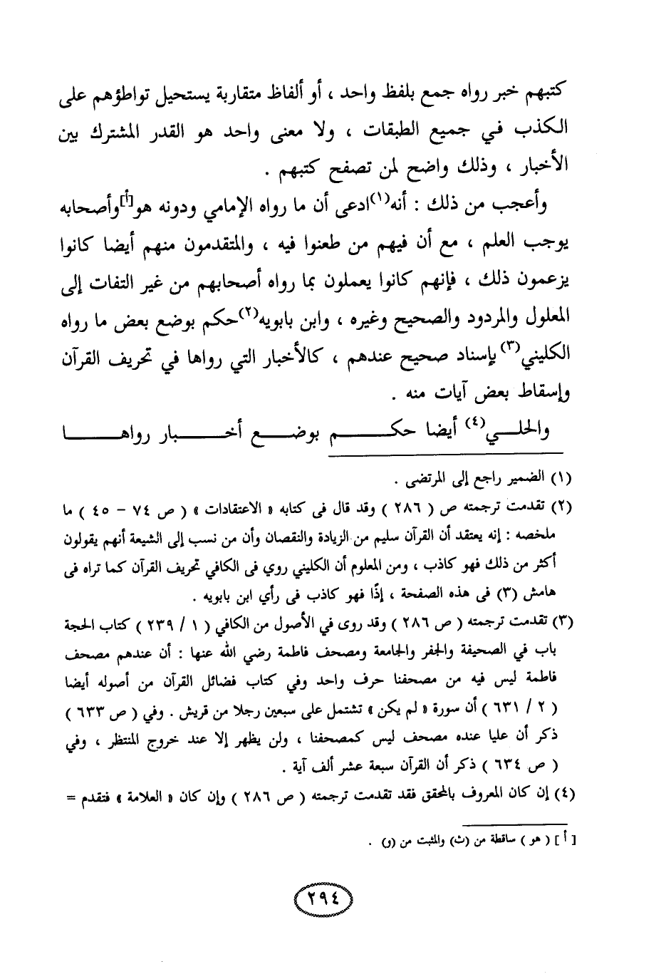 وأعجب من ذلك: أنه ادعى أن ما رواه الإمامي ودونه هو وأصحابه يوجب العلم، مع أن فيهم من طعنوا فيه، والمتقدمون منهم أيضا كانوا يزعمون ذلك، فإنهم كانوا يعملون بما رواه أصحابهم من غير التفات إلى المعلول والمردود والصحيح وغيره، وابن بابويه حكم بوضع بعض ما رواه الكليني بإسناد صحيح عندهم، كالأخبار التي رواها في تحريف القرآن