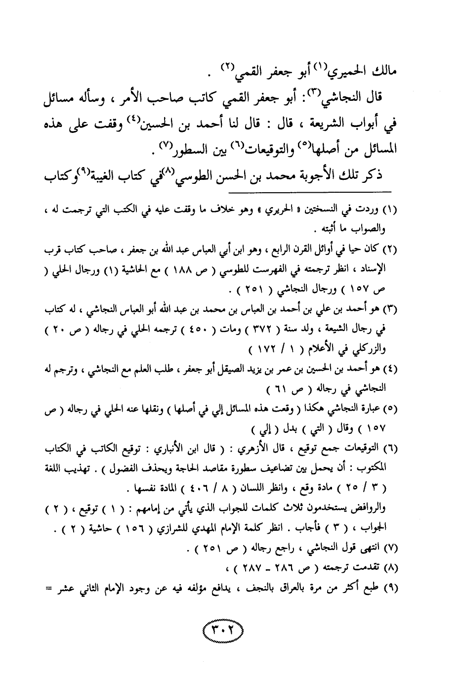 قال النجاشي: أبو جعفر القمي كاتب صاحب الأمر، وسأله مسائل في أبواب الشريعة، قال: قال لنا أحمد بن الحسين: وقفت على هذه المسائل من أصلها والتوقيعات بين السطور.