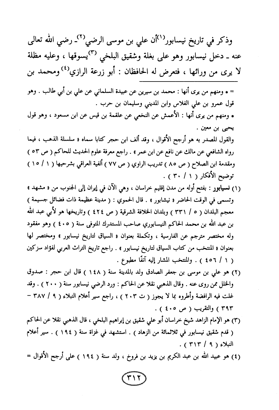 وذكر في تاريخ نيسابور أن علي بن موسى الرضي رضي الله تعالى عنه دخل نيسابور وهو على بغلة وشقيق البلخي يسوقها، وعليه مظلة لا يرى من ورائها، فتعرض له الحافظان: أبو زرعة الرازي ومحمد بن