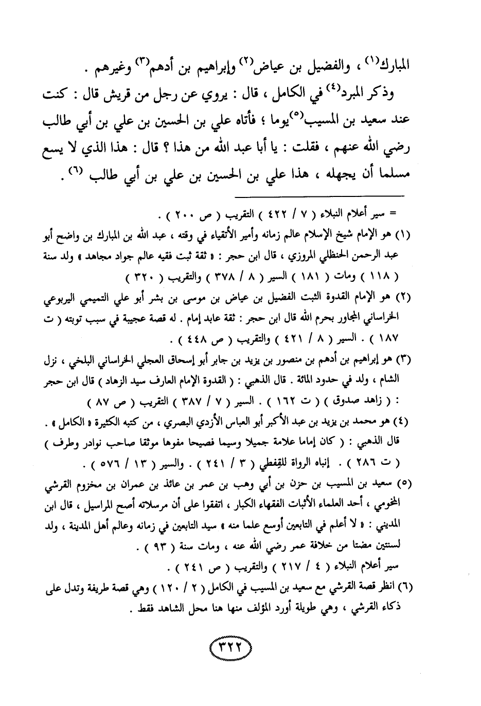 وذكر المبرد في الكامل، قال: يروي عن رجل من قريش قال: كنت عند سعيد بن المسيب يوما؛ فأتاه علي بن الحسين بن علي بن أبي طالب رضي الله عنهم، فقلت: يا أبا عبد الله من هذا؟ قال: هذا الذي لا يسع مسلما أن يجهله، هذا علي بن الحسين بن علي بن أبي طالب.