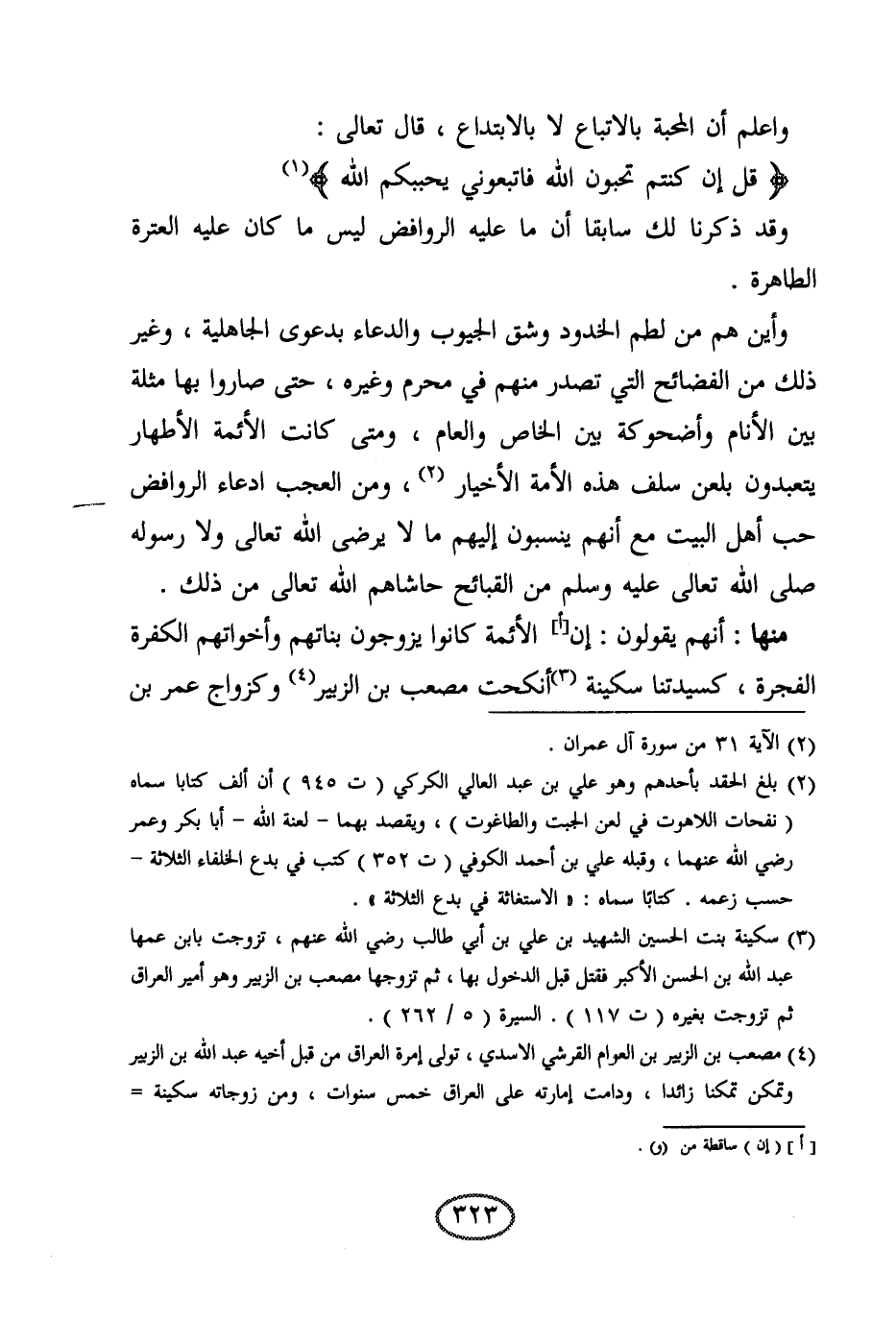 واعلم أن المحبة بالاتباع لا بالابتداع، قال تعالى: {قُلْ إِنْ كُنْتُمْ تُحِبُّونَ اللَّهَ فَاتَّبِعُونِي يُحْبِبْكُمُ اللَّهُ} ، وقد ذكرنا سابقا أن ما عليه الروافض ليس ما كان عليه العترة الطاهرة.