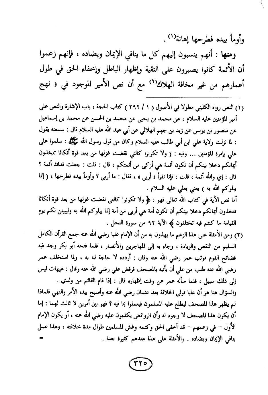 ومنها: أنهم ينسبون إليهم كل ما ينافي الإيمان ويضاده، فإنهم زعموا أن الأئمة كانوا يصبرون على التقية وإظهار الباطل وإخفاء الحق في طول أعمارهم من غير مخافة الهلاك، مع أن نص الأمير الموجود في " نهج