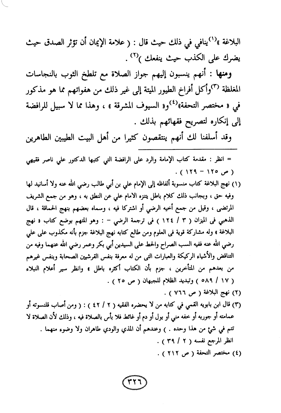 ومنها: أنهم ينسبون إليهم جواز الصلاة مع تلطخ الثوب بالنجاسات المغلظة وأكل أفراخ الطيور الميتة إلى غير ذلك من هفواتهم مما هو مذكور في " مختصر التحفة " و " السيوف المشرقة "، وهذا مما لا سبيل للرافضة إلى إنكاره لتصريح فقهائهم بذلك. وقد أسلفنا لك أنهم ينتقصون كثيرا من أهل البيت الطيبين الطاهرين