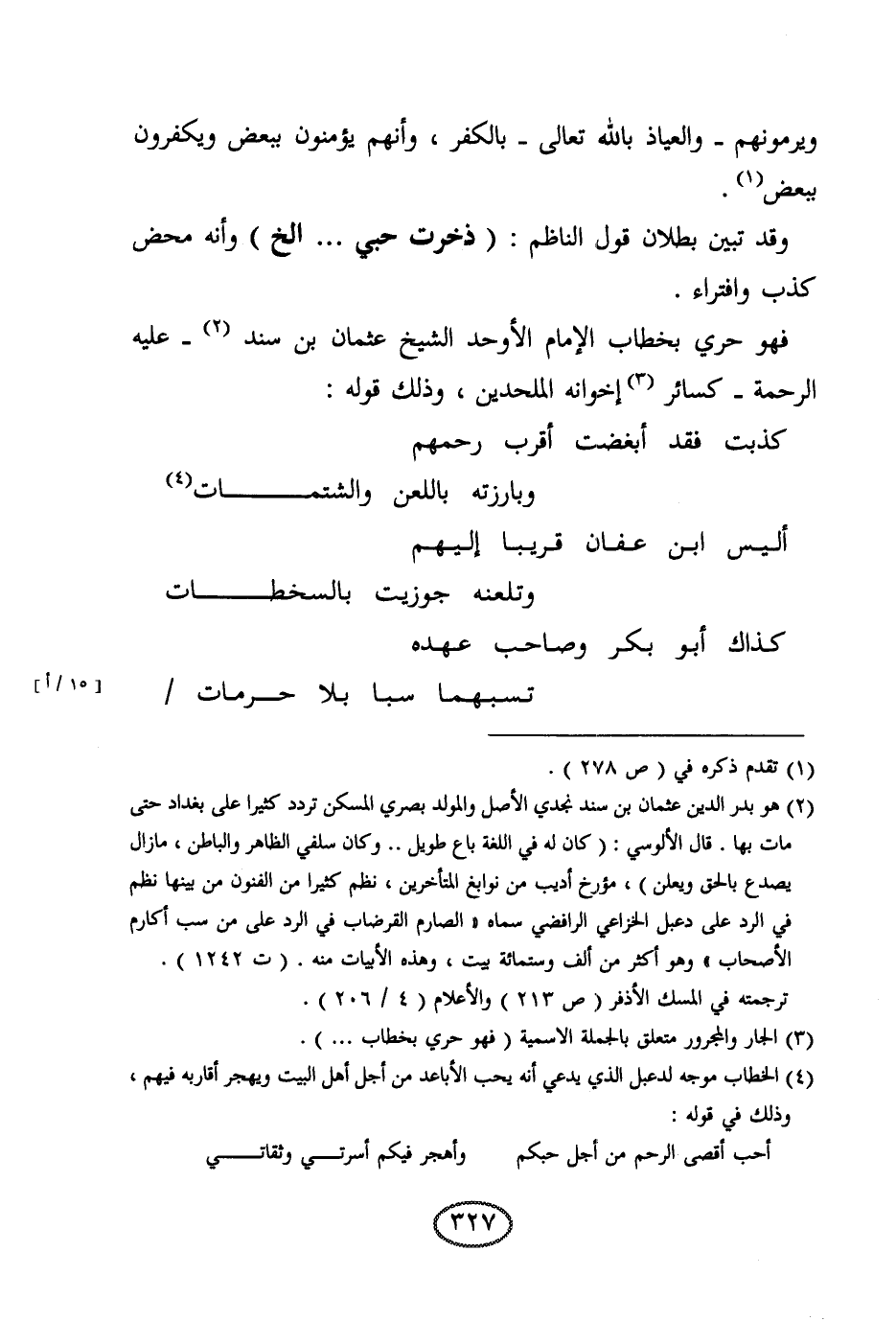 وقد تبين بطلان قول الناظم: (ذخرت حبي ... إلخ) وأنه محض كذب وافتراء. فهو حري بخطاب الإمام الأوحد الشيخ عثمان بن سند -عليه الرحمة- كسائر إخوانه الملحدين. وذلك قوله: