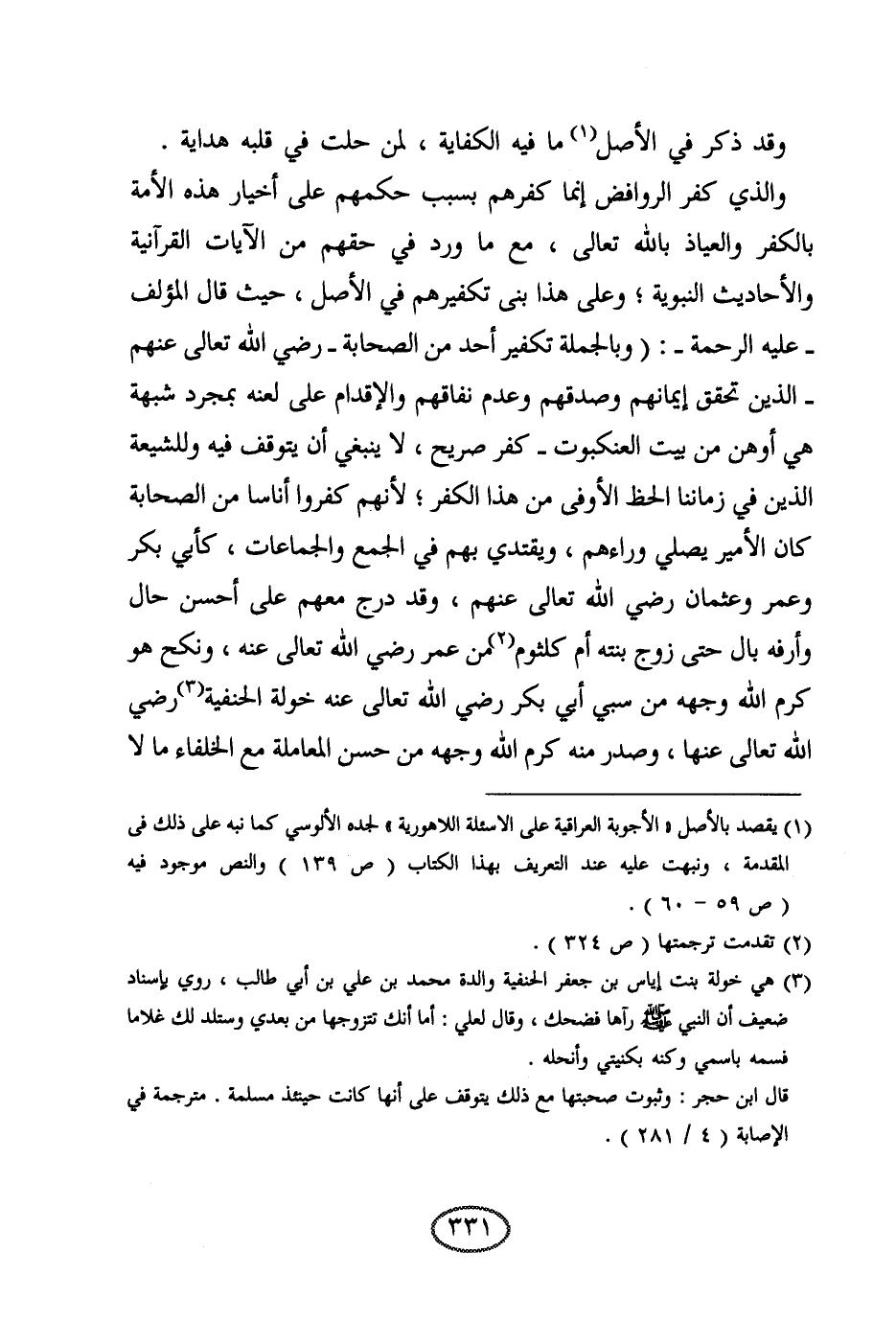 وعلى هذا بنى تكفيرهم في الأصل، حيث قال المؤلف -عليه الرحمة-: (وبالجملة تكفير أحد من الصحابة رضي الله تعالى عنهم الذين تحقق إيمانهم وصدقهم وعدم نفاقهم والإقدام على لعنه بمجرد شبهة هي أوهن من بيت العنكبوت -كفر صريح، لا ينبغي أن يتوقف فيه، وللشيعة الذين في زماننا الحظ الأوفى من هذا الكفر؛ لأنهم كفروا أناسا من الصحابة كان الأمير يصلي وراءهم، ويقتدي بهم في الجمع والجماعات، كأبي بكر وعمر وعثمان رضي الله تعالى عنهم، وقد درج معهم على أحسن حال وأرفه بال حتى زوج بنته أم كلثوم من عمر رضي الله تعالى عنه، ونكح هو كرم الله وجهه من سبي أبي بكر رضي الله تعالى عنه خولة الحنفية رضي الله تعالى عنها، وصدر منه كرم الله وجهه من حسن المعاملة مع الخلفاء ما لا