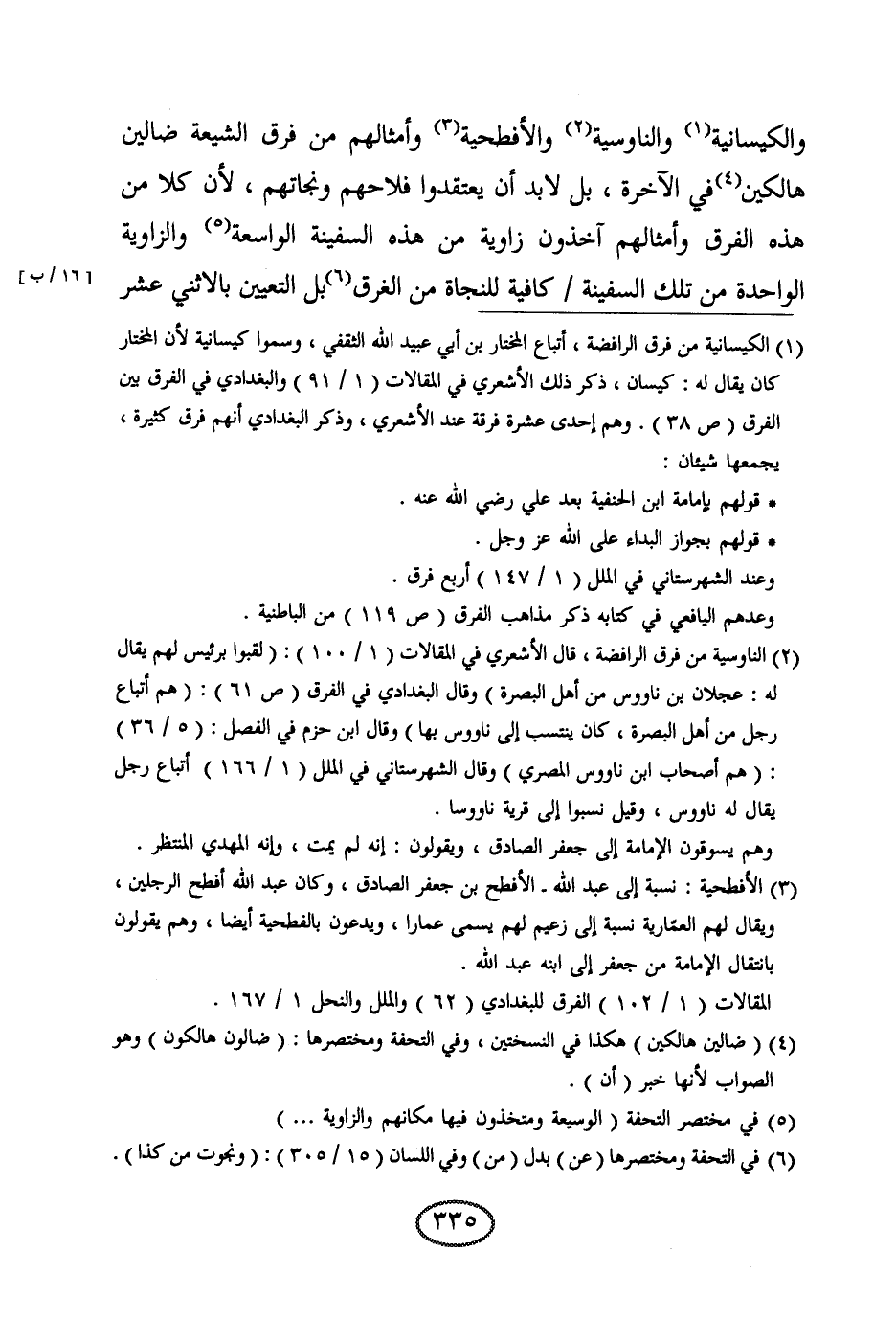 والكيسانية والناوسية والأفطحية وأمثالهم من فرق الشيعة ضالين هالكين في الآخرة، بل لا بد أن يعتقدوا فلاحهم ونجاتهم، لأن كلا من هذه الفرق وأمثالهم آخذون زاوية من هذه السفينة الواسعة، والزاوية الواحدة من تلك السفينة كافية للنجاة من الغرق، بل التعيين بالاثني عشر