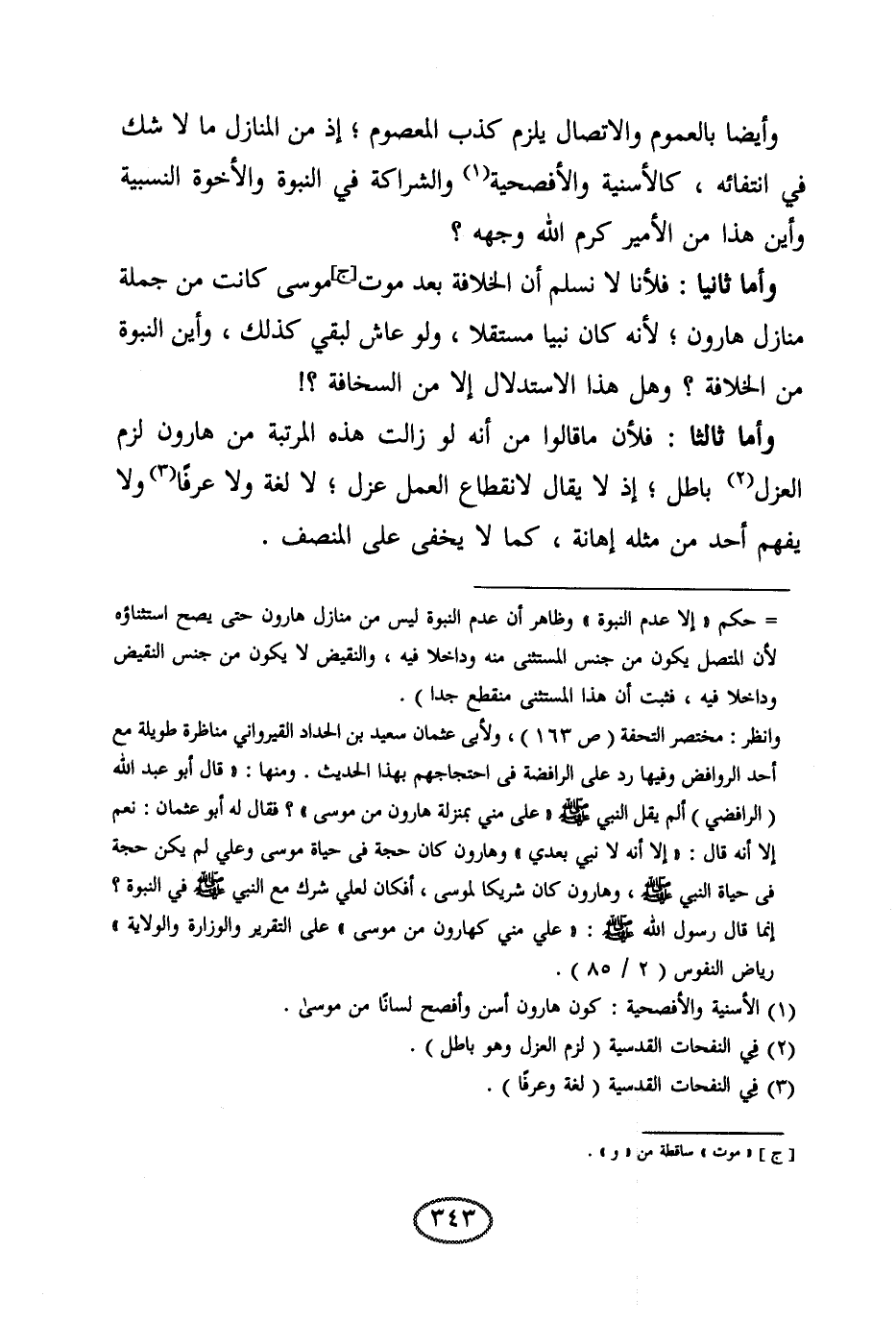 وأما ثانيا: فلأنا لا نسلم أن الخلافة بعد موت موسى كانت من جملة منازل هارون؛ لأنه كان نبيا مستقلا، ولو عاش لبقي كذلك، وأين النبوة من الخلافة؟ وهل هذا الاستدلال إلا من السخافة؟! .