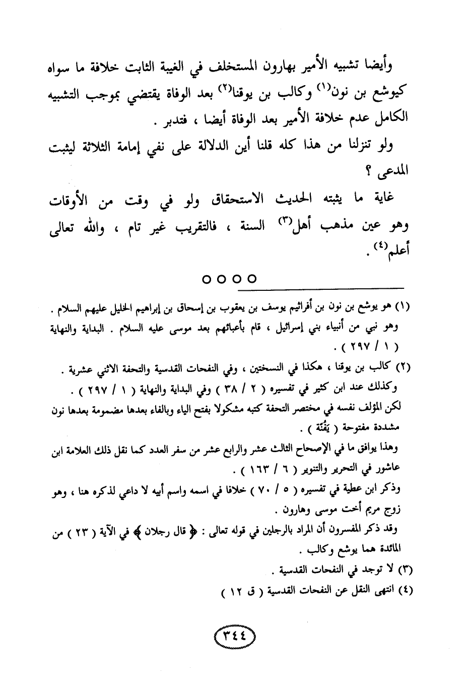 وأيضا: تشبيه الأمير بهارون المستخلف في الغيبة الثابت خلافة ما سواه كيوشع بن نون وكالب بن يوقنا، بعد الوفاة، يقتضي بموجب التشبيه الكامل عدم خلافة الأمير بعد الوفاة أيضا، فتدبر.