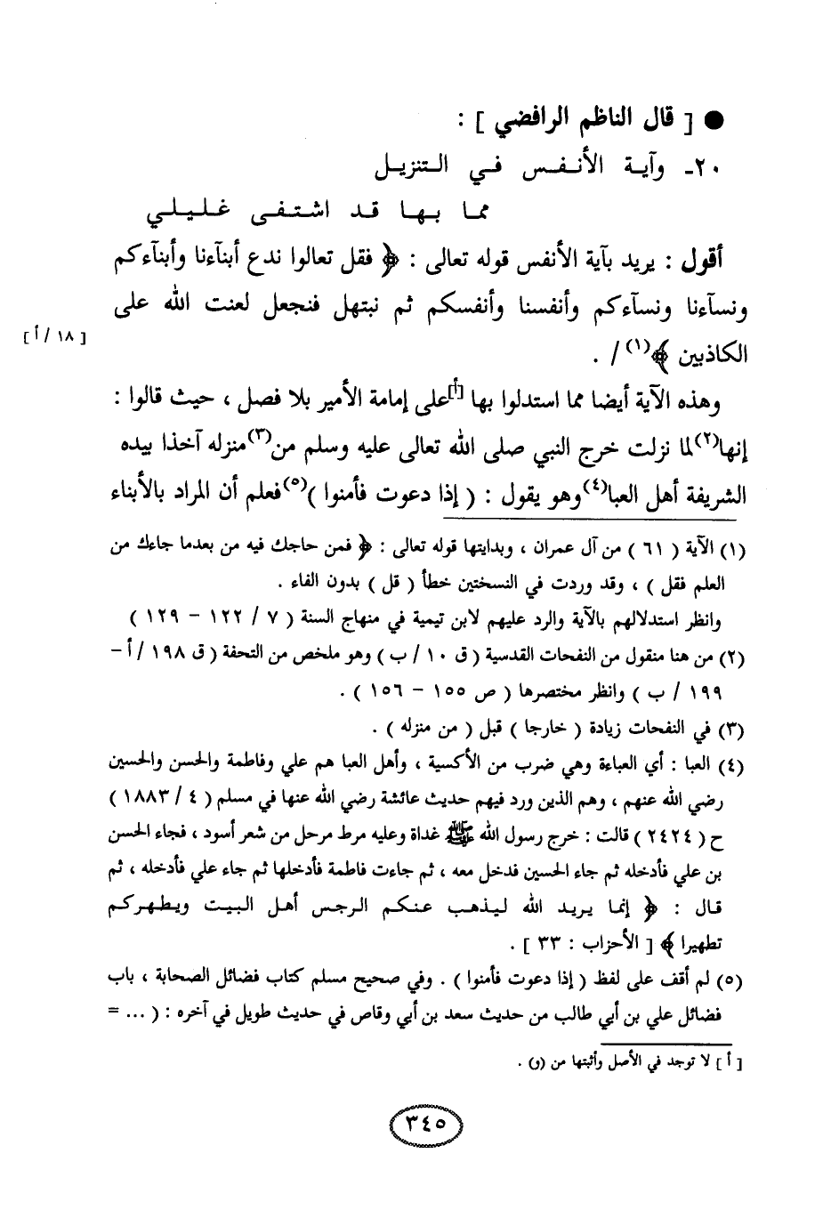 أقول: يريد بآية الأنفس قوله تعالى: {فَقُلْ تَعَالَوْا نَدْعُ أَبْنَاءَنَا وَأَبْنَاءَكُمْ وَنِسَاءَنَا وَنِسَاءَكُمْ وَأَنْفُسَنَا وَأَنْفُسَكُمْ ثُمَّ نَبْتَهِلْ فَنَجْعَلْ لَعْنَةَ اللَّهِ عَلَى الْكَاذِبِينَ} .