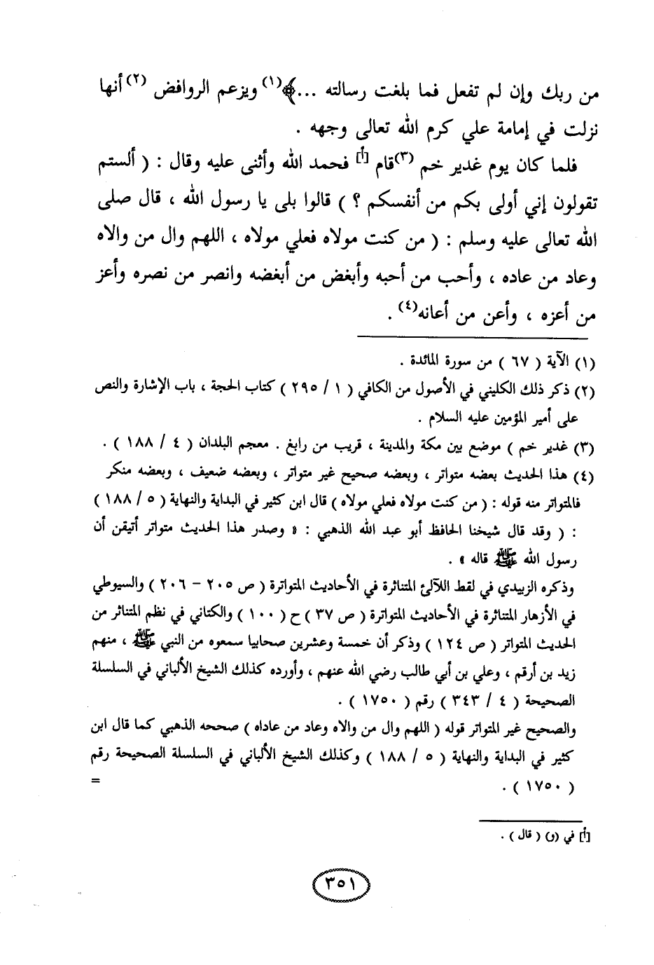 «فلما كان يوم غدير خم قام فحمد الله وأثنى عليه وقال: (ألستم تقولون: إني أولى بكم من أنفسكم؟) قالوا: بلى يا رسول الله، قال صلى الله تعالى عليه وسلم: (من كنت مولاه فعلي مولاه، اللهم وال من والاه وعاد من عاداه، وأحب من أحبه وأبغض من أبغضه وانصر من نصره وأعز من أعزه، وأعن من أعانه» .