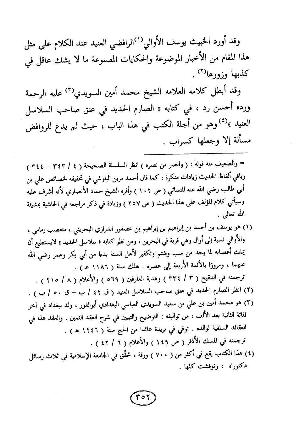 وقد أبطل كلامه العلامة الشيخ محمد أمين السويدي عليه الرحمة ورده أحسن رد، في كتابه " الصارم الحديد في عنق صاحب السلاسل العنيد " وهو من أجلة الكتب في هذا الباب، حيث لم يدع للروافض مسألة إلا جعلها كسراب.