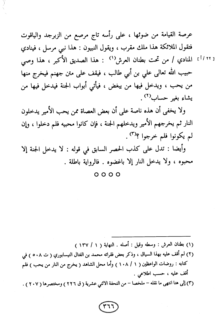 «عرصة القيامة من ضوئها، على رأسه تاج مرصع من الزبرجد والياقوت، فتقول الملائكة: هذا ملك مقرب، ويقول النبيون: هذا نبي مرسل، فينادي المنادي من تحت بطنان العرش: هذا الصديق الأكبر، هذا وصي حبيب الله تعالى علي بن أبي طالب، فيقف على متن جهنم فيخرج منها من يحب، ويدخل فيها من يبغض، فيأتي أبواب الجنة فيدخل فيها من يشاء بغير حساب» .