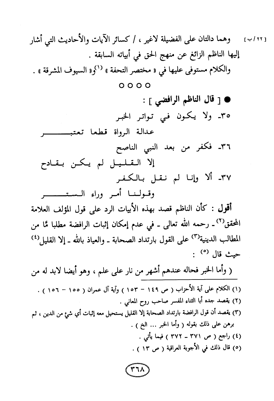 أقول: كأن الناظم قصد بهذه الأبيات الرد على قول المؤلف العلامة المحقق -رحمه الله تعالى- في عدم إمكان إثبات الرافضة مطلبا ما من المطالب الدينية على القول بارتداد الصحابة -والعياذ بالله- إلا القليل، حيث قال: (وأما الخبر فحاله عندهم أشهر من نار على علم، وهو أيضا لا بد له من