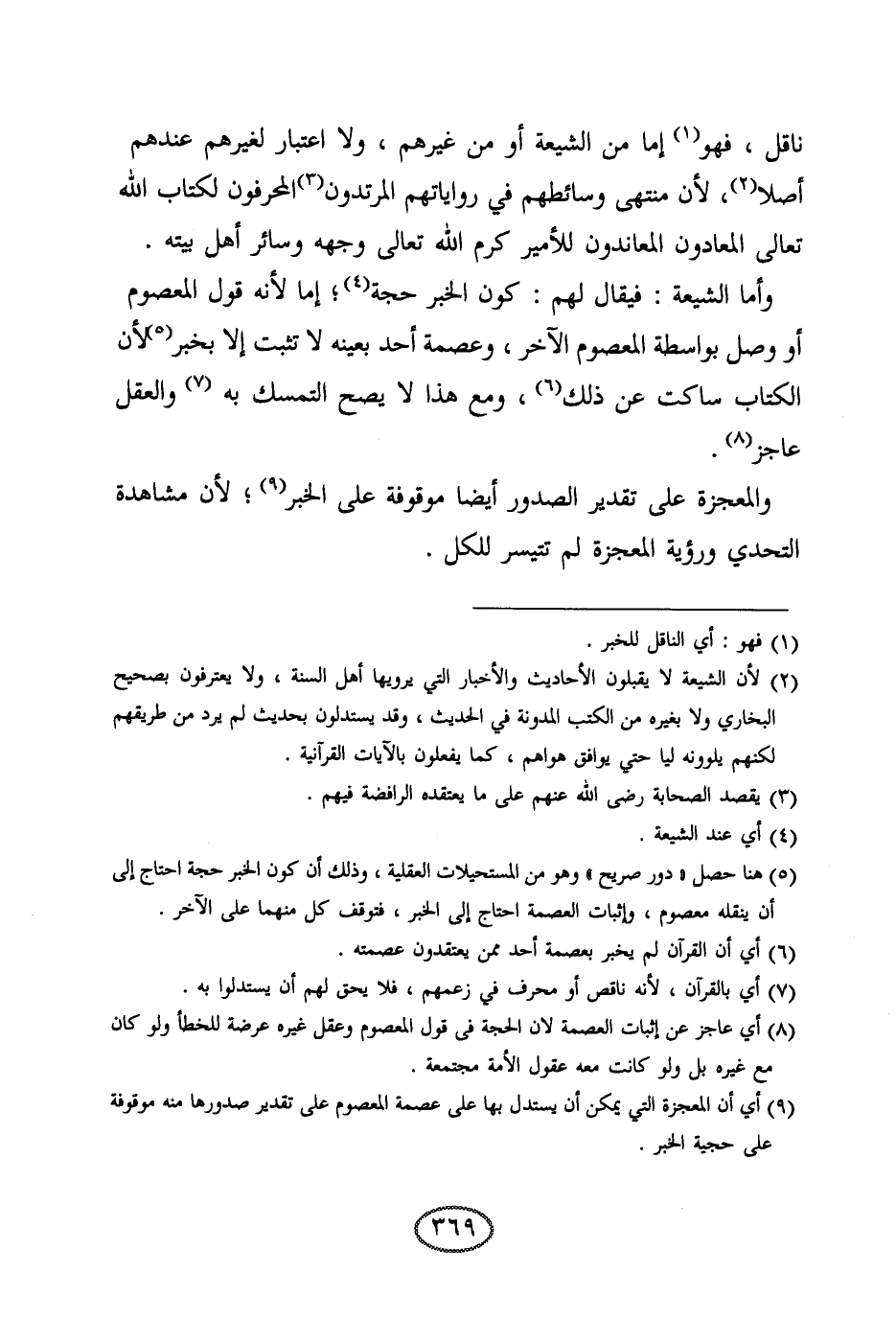 وأما الشيعة: فيقال لهم: كون الخبر حجة؛ إما لأنه قول المعصوم أو وصل بواسطة المعصوم الآخر، وعصمة أحد بعينه لا تثبت إلا بخبر لأن الكتاب ساكت عن ذلك، ومع هذا لا يصح التمسك به والعقل عاجز.